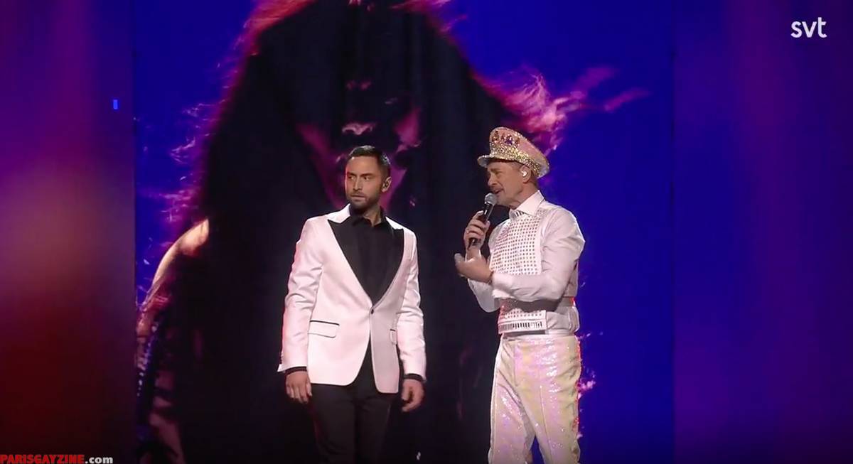 La prestation de Måns nous fait penser à celle de l’Eurovision 2016 avec Petra Mede… même si cela n’est pas aussi réussie.