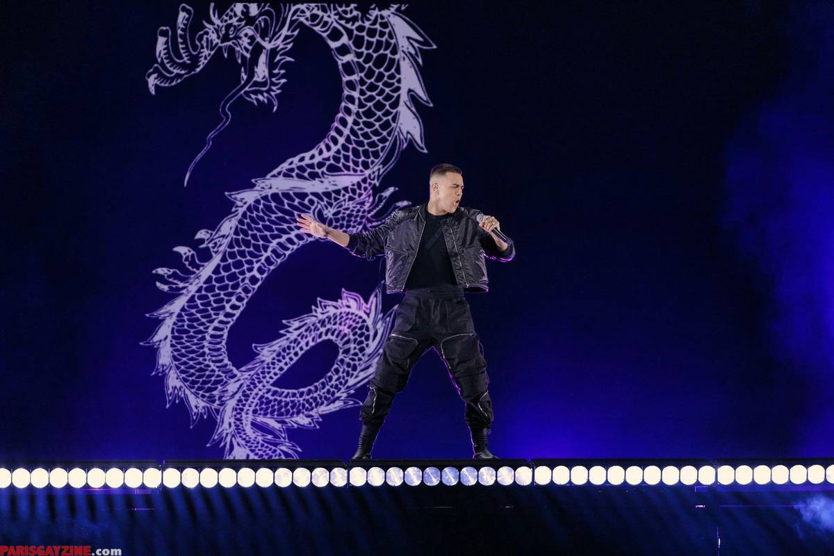 Sur scène dans son bombers noir, le jeune homme de 24 ans danse devant son image projetée sur écran, ainsi qu’un petit dragon avec lequel il joue par moment.