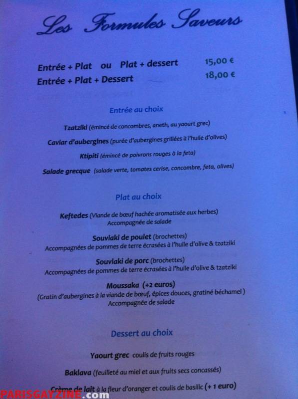Tout un choix de spécialités s'offre à vous : caviar d’aubergines, le Tzatziki, la Moussaka, gambas Saganaki, Pastitsio (petites pâtes grecques sur un lit de viande hachée tomatée, gratinée de fromage), Keftedes (viande hachée d'agneau, aromatisée à la menthe), Souvlaki de porc et en dessert le Galaktoboureko, un feuilleté de semoule au lait à la fleur d'oranger, un crémeux de mascarpone ou une Soupe de fraises par exemple.