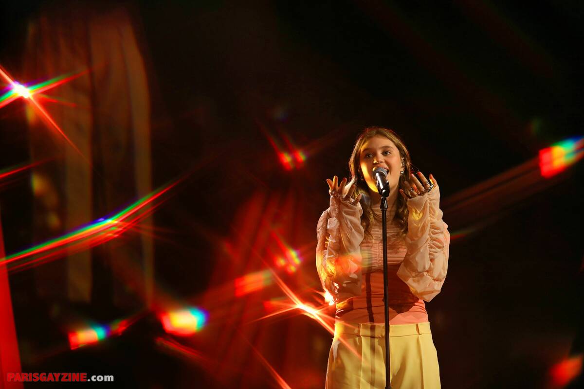 Assise tout d’abord sur un rideau orange, Ida-Lova se lève sans s’emmêler les pieds dans ce long voile et poursuit son interprétation, toute mignonne dans sa tenue en tulles aux couleurs claires.