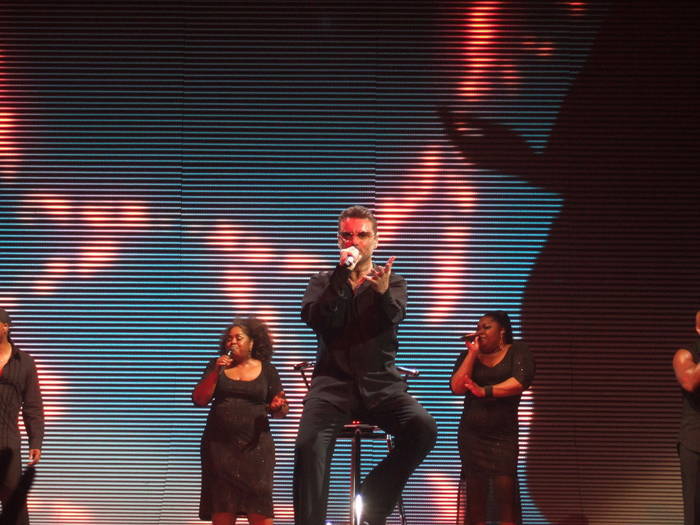 Un assistant lui porte une chaise pendant l'intro de la douce ballade "Father figure". Derrière l'artiste, ses six choristes (dont deux voix sont masculines) sont alignés devant la diffusion d'un montage de symboles rouges. Sur "Star People" ceux sont des flocons de couleurs qui tombent. L'ambiance est si intense que le chanteur va jusqu'à mettre son doigt sur la bouche pour demander la fin des applaudissements du public. Debout et seul en scène, l'ascendant chypriote grec interprète "The first time ever I saw your face".