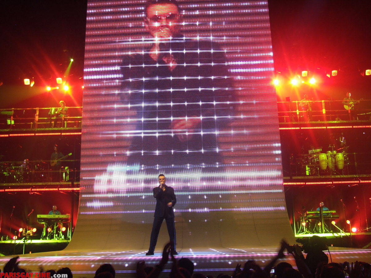 L'écran LCD est coloré de rouge lorsque le chanteur né en 1963 apparaît enfin à son public sur les premières notes de "Flawless". Le showman porte une tunique noire et des lunettes de soleil aux verres fumés. Le public frappe des mains dans un Bercy surchauffé. Il dit en français "Tout le monde" alors que le public lève les bras sur son tube "Faslove" illustré par des boules à facette et d'autres figures en strass qui défilent sur l'écran comme un globe, des cerises, une planète et des cœurs.