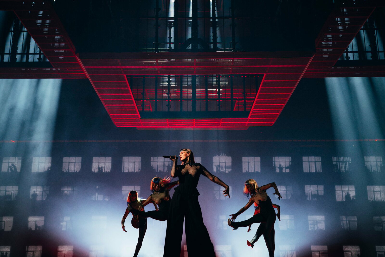 Sur la scène de Malmö, Besa arbore une belle tenue de scène turquoise sur un tableau qui fait grandement appel à la vidéo.