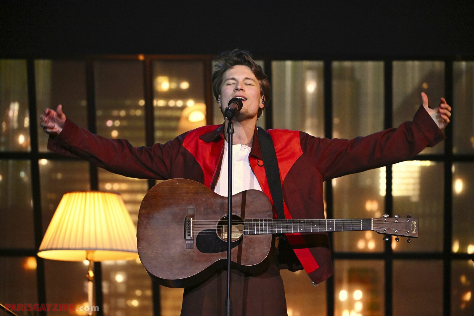 Vilhelm Buchaus débute sa performance à la guitare, assis près d’une lampe dans un décor représentant un appartement dans un haut building. Dans son courant musical et avec sa voix, il rappelle Vianney et Ed Sheeran.