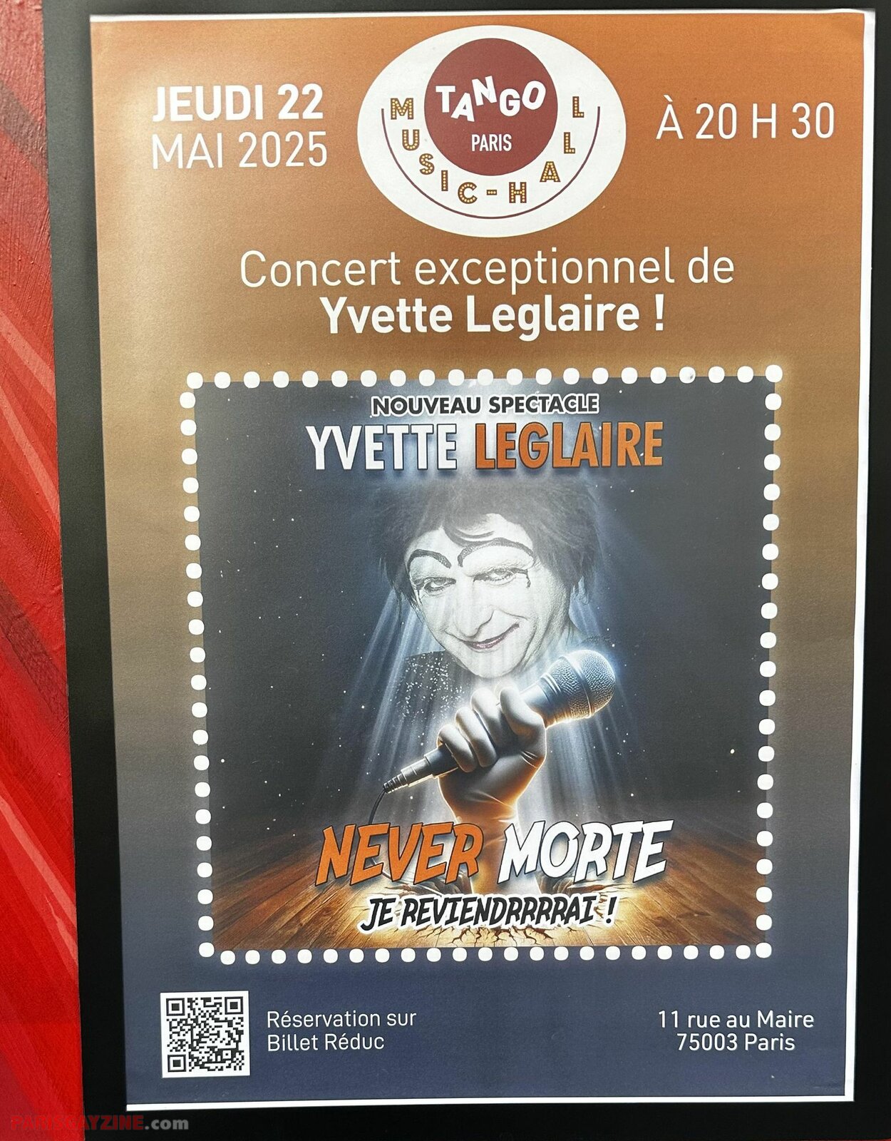 Le 22 mai 2025, Yvette Leglaire a enflammé la scène du Tango (11 rue au Maire, Paris 3e) avec son spectacle « Never Morte ». Dans ce show mêlant récital déjanté et humour bien senti, elle a fêté ses 20 ans de retour sur scène avec son style inimitable, entre parodies décalées et auto-dérision savoureuse. Fidèle à elle-même, Yvette a fait danser la salle avec sa fameuse « Leglaire Dance », dans ce lieu mythique du Marais.
