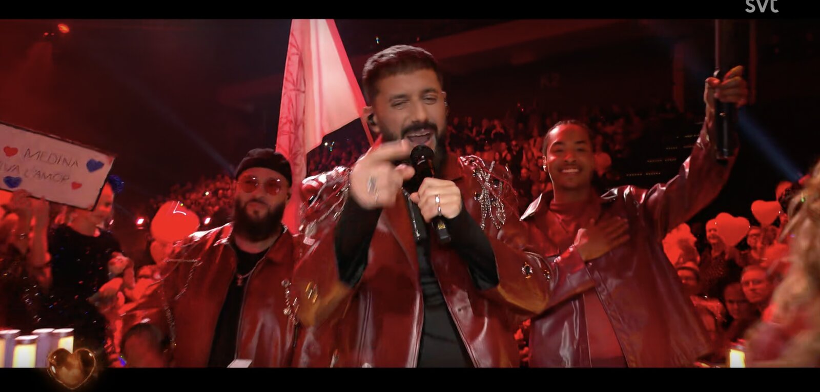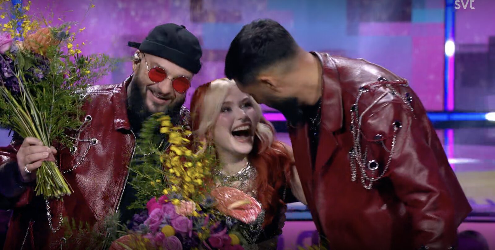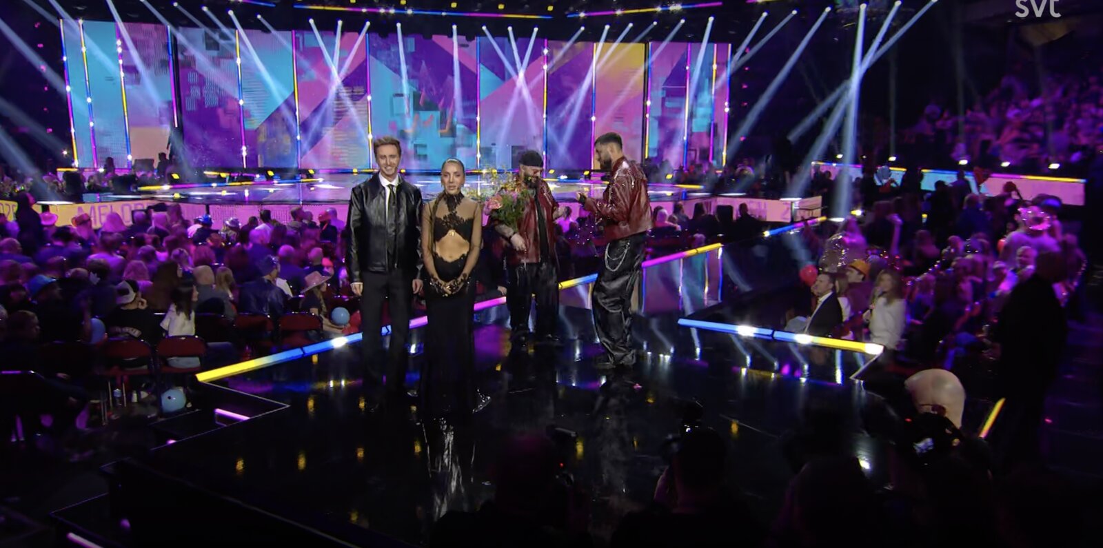 Derrière son pupitre, Hampus confirme que l’amour triomphe ce soir avec …les Medina ! Ils embrassent leurs auteurs-compositeurs Anderz Wrethov et Jimmy "Joker" Thörnfeldt (Dino Medanhodzic est absent ce soir).
