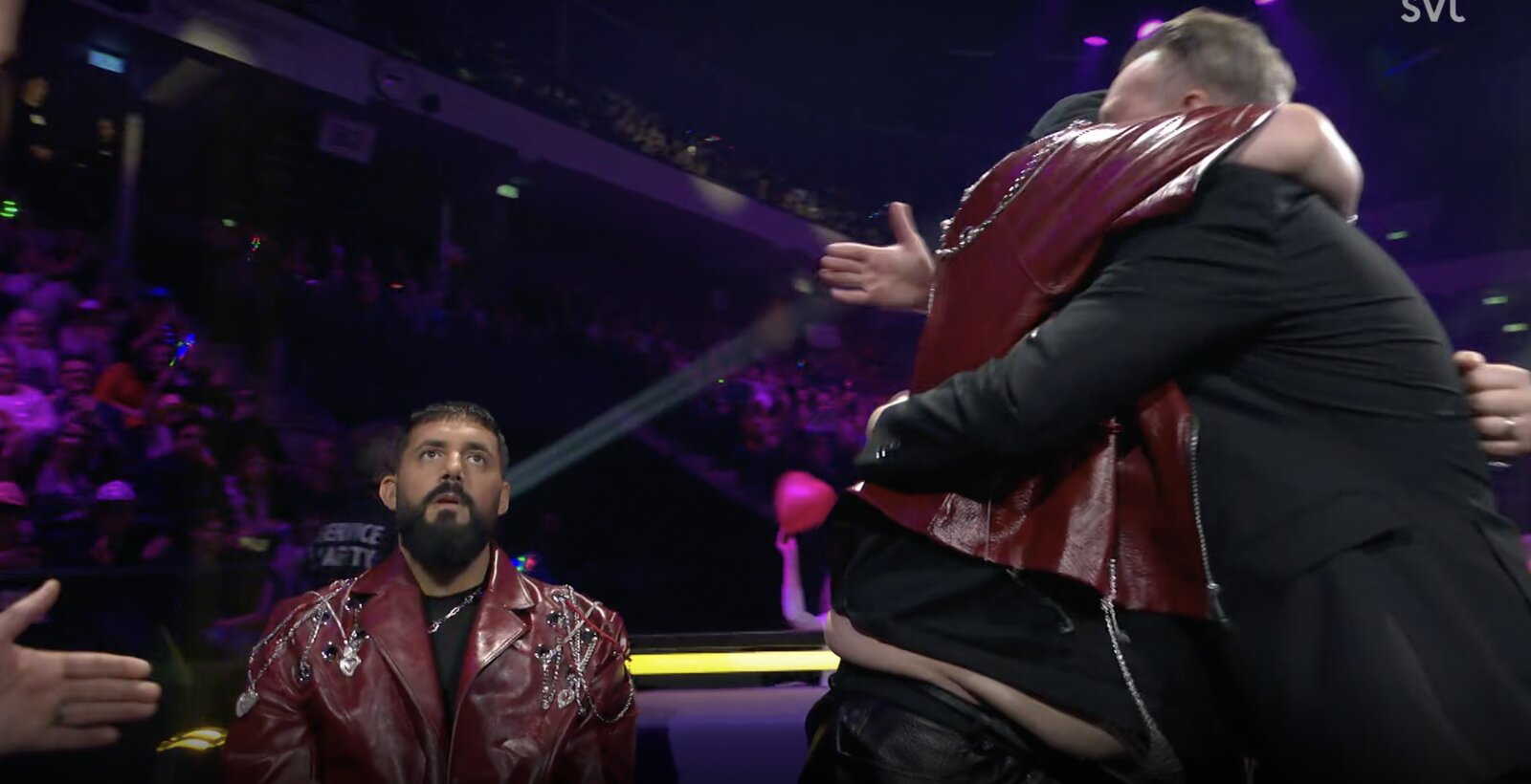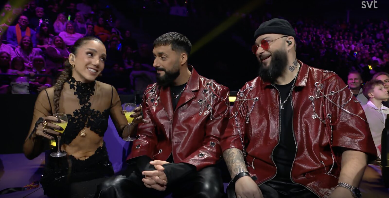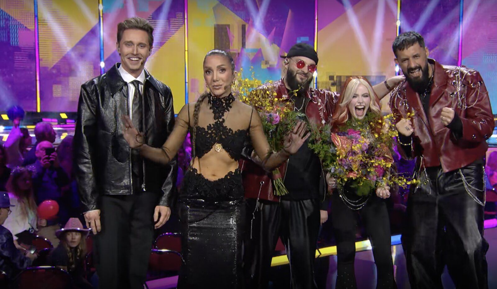 Derrière son pupitre, Hampus confirme que l’amour triomphe ce soir avec …les Medina ! Ils embrassent leurs auteurs-compositeurs Anderz Wrethov et Jimmy "Joker" Thörnfeldt (Dino Medanhodzic est absent ce soir).