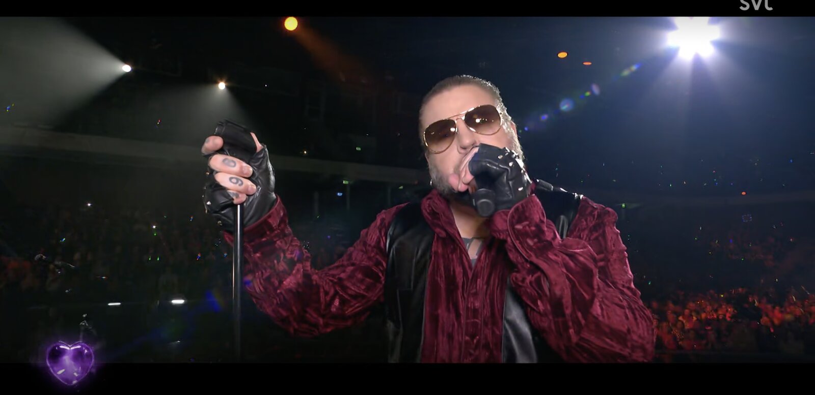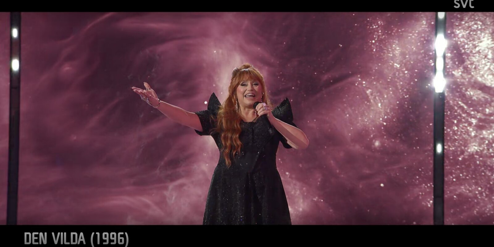 Un retour à 1996 avec "Den vilda" la montre seule sur un fond mauve, soulignant une présence scénique plus épurée. Elle arbore toujours ses épaulettes pointues noires pailletées, renforçant l’impact visuel de l’ensemble.
