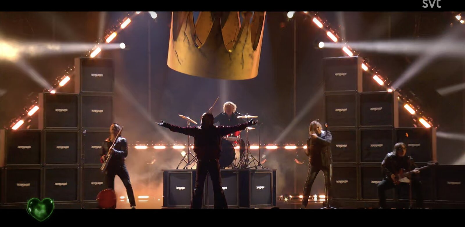 Au centre et en hauteur trône une couronne géante dorée, élément central de la scénographie. De nombreuses enceintes, siglées au nom du groupe, sont disposées sur le plateau. Les musiciens portent des tenues en cuir, cohérentes avec l’esthétique revendiquée.