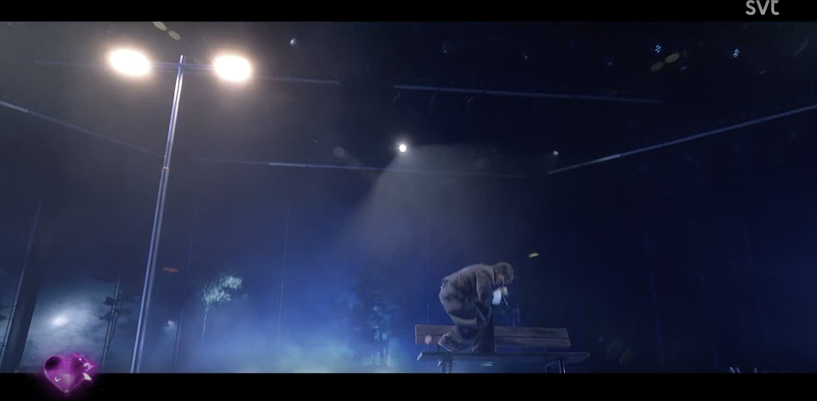 La mise en scène évolue progressivement : une forêt en flammes apparaît en arrière-plan, avant de laisser place à une nuit bleutée. L’ensemble crée une atmosphère douce et maîtrisée, en accord avec l’interprétation.