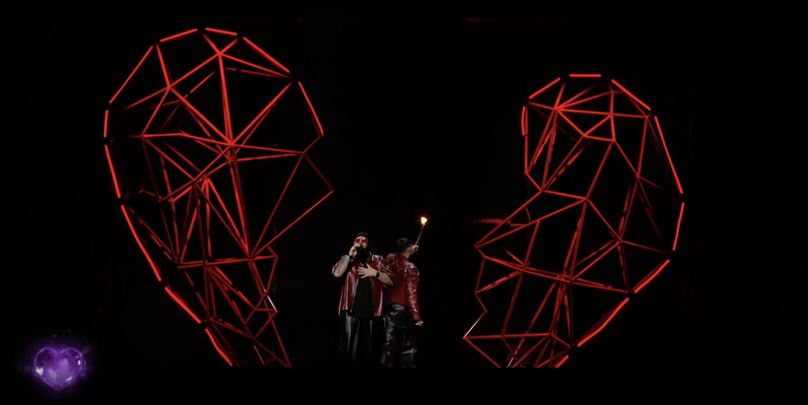Côté costumes, Ali & Sami portent un blouson en cuir bordeaux orné de chaînes métalliques, sur une tenue noire. Sami, muni d’une torche, joue un rôle central dans la mise en scène : il embrase le cœur, dont les deux parties finissent par se rejoindre, symbolisant l’union célébrée par la chanson.