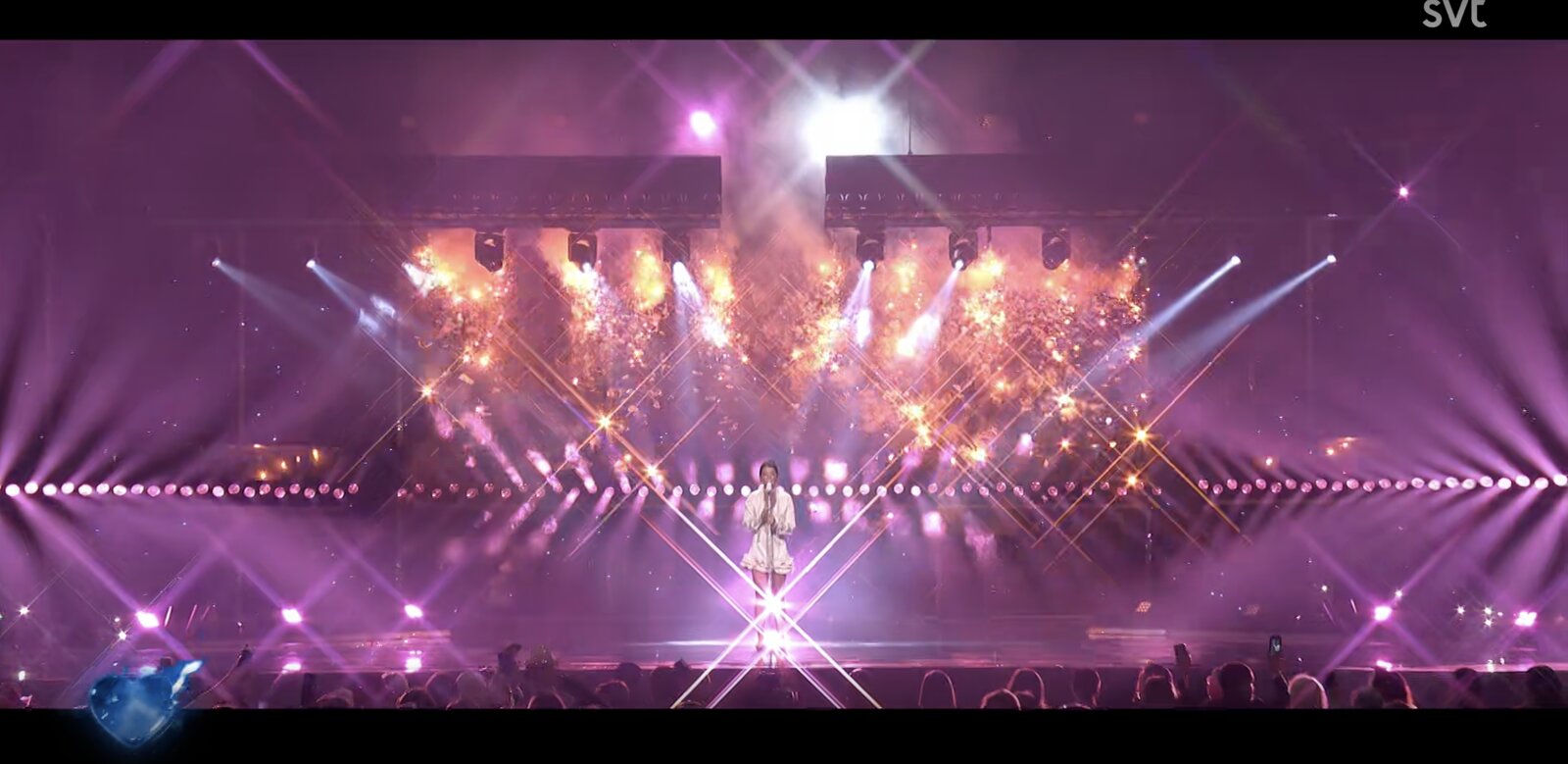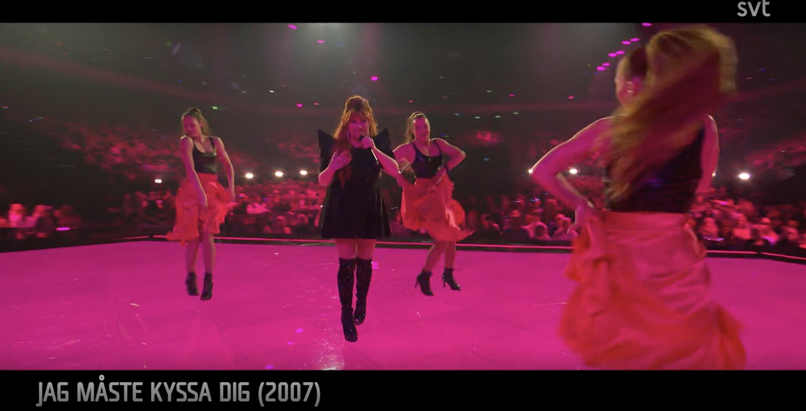 Sur "Håll om mig" (2005) enfin, elle investit le catwalk avec une troupe de danseurs en tenues argentées, dans une ambiance club affirmée. Après un rapide changement de costume, elle apparaît en petite robe orange, tenue coordonnée à celle des danseurs, concluant la prestation sur une note énergique et visuellement forte.