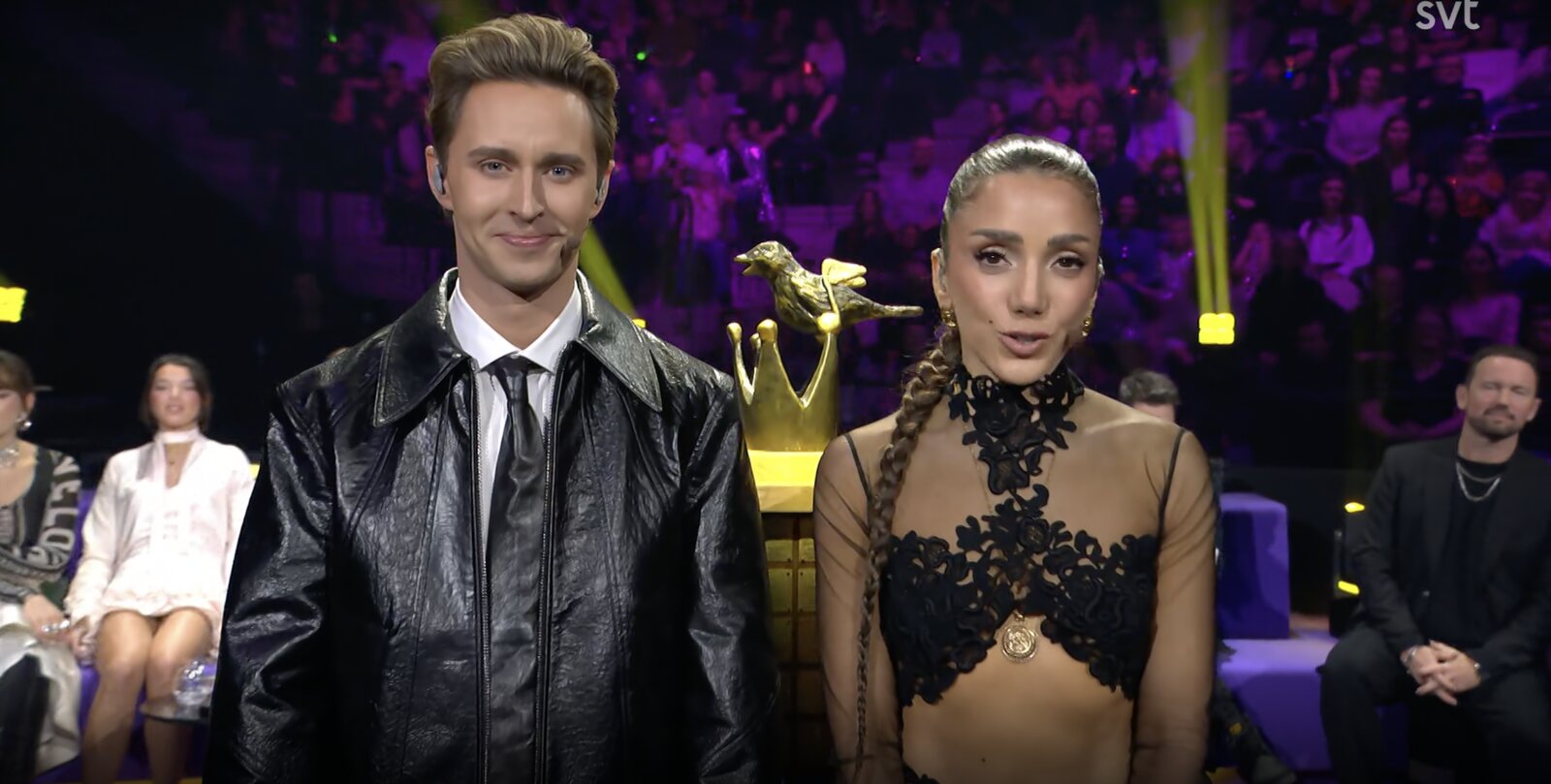 Gina Dirawi et Hampus Nessvold sont maintenant devant la statuette du grand oiseau chanteur. En green room, ils donnent ensuite la parole aux artistes, un à un.