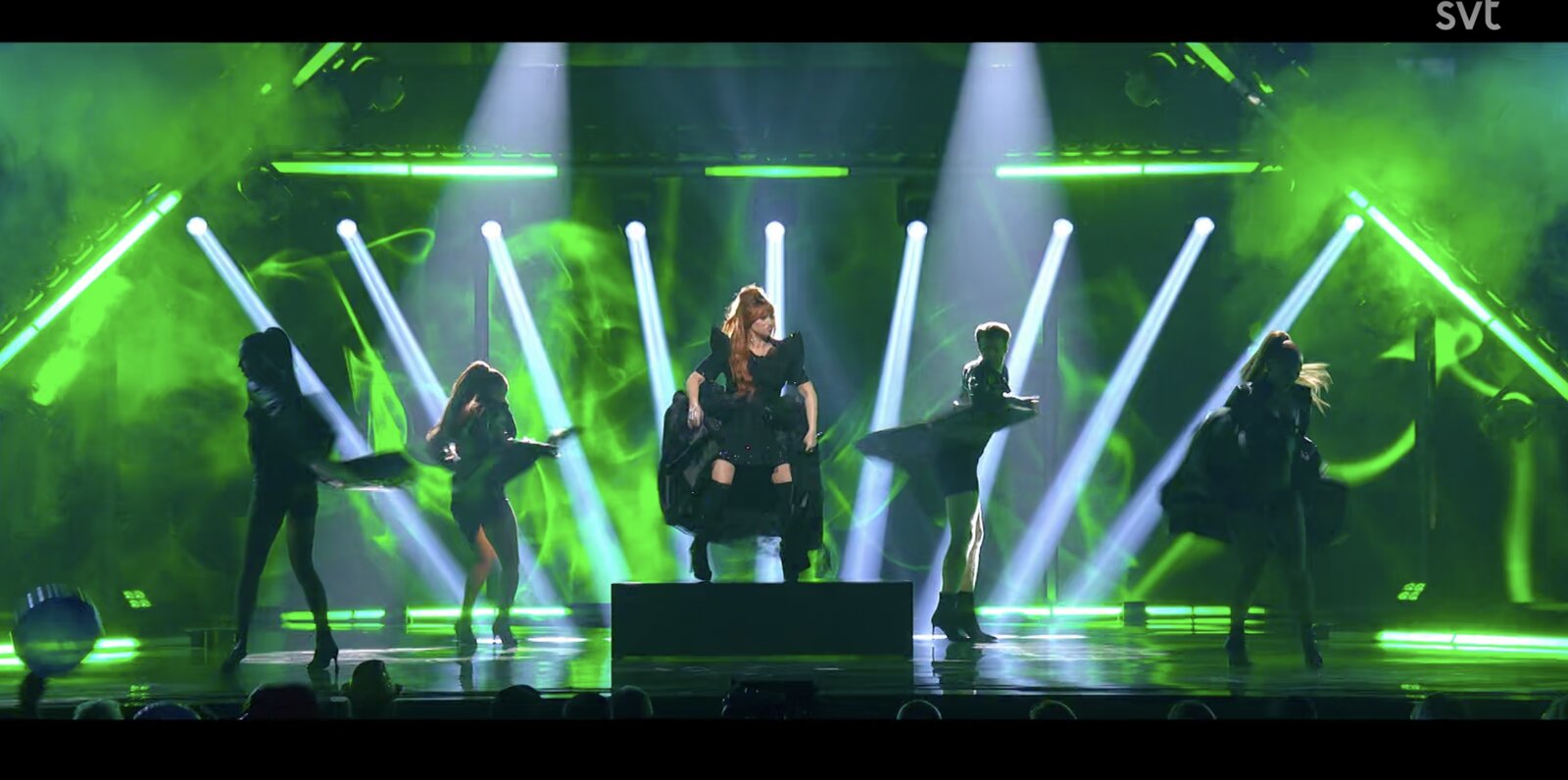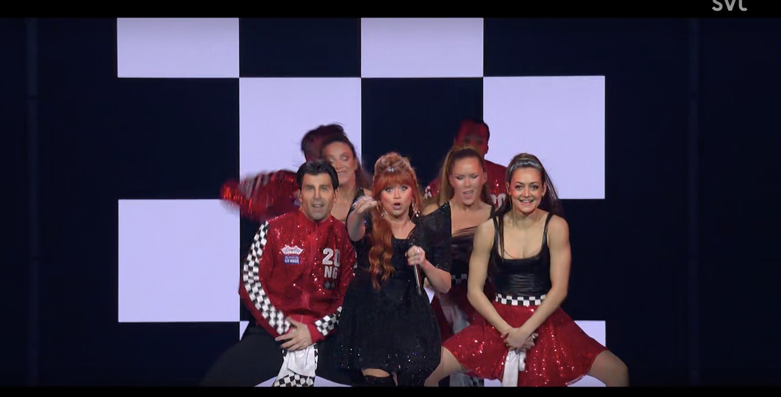 Le tableau se poursuit avec "Avundsjuk", présenté dans une version rock aux sonorités indiennes, puis "Alexandra", chorégraphié avec deux danseurs : Lamin Holmén, en rose, et Daniel Gürow, en bleu. Pour "Jag måste kyssa dig" (2007), elle est accompagnée de danseuses, tandis que "Carpool Karaoke" (2020) adopte une esthétique visuelle en damier, les interprètes portant des blousons rouges assortis.