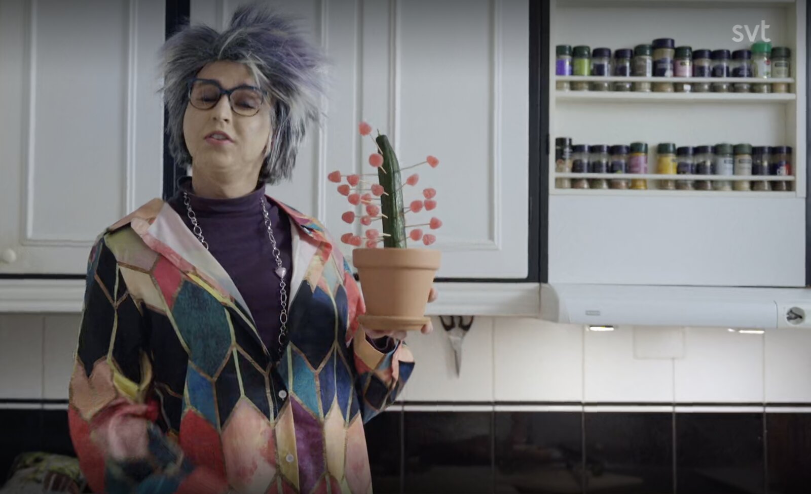 Dans la séquence humoristique suivante, Hampus Nessvold incarne Suzanne Svensson (49 ans), une excentrique qui décore son concombre, ne lésine pas sur la laque, se rend au supermarché et à un karaoké/quizz.
