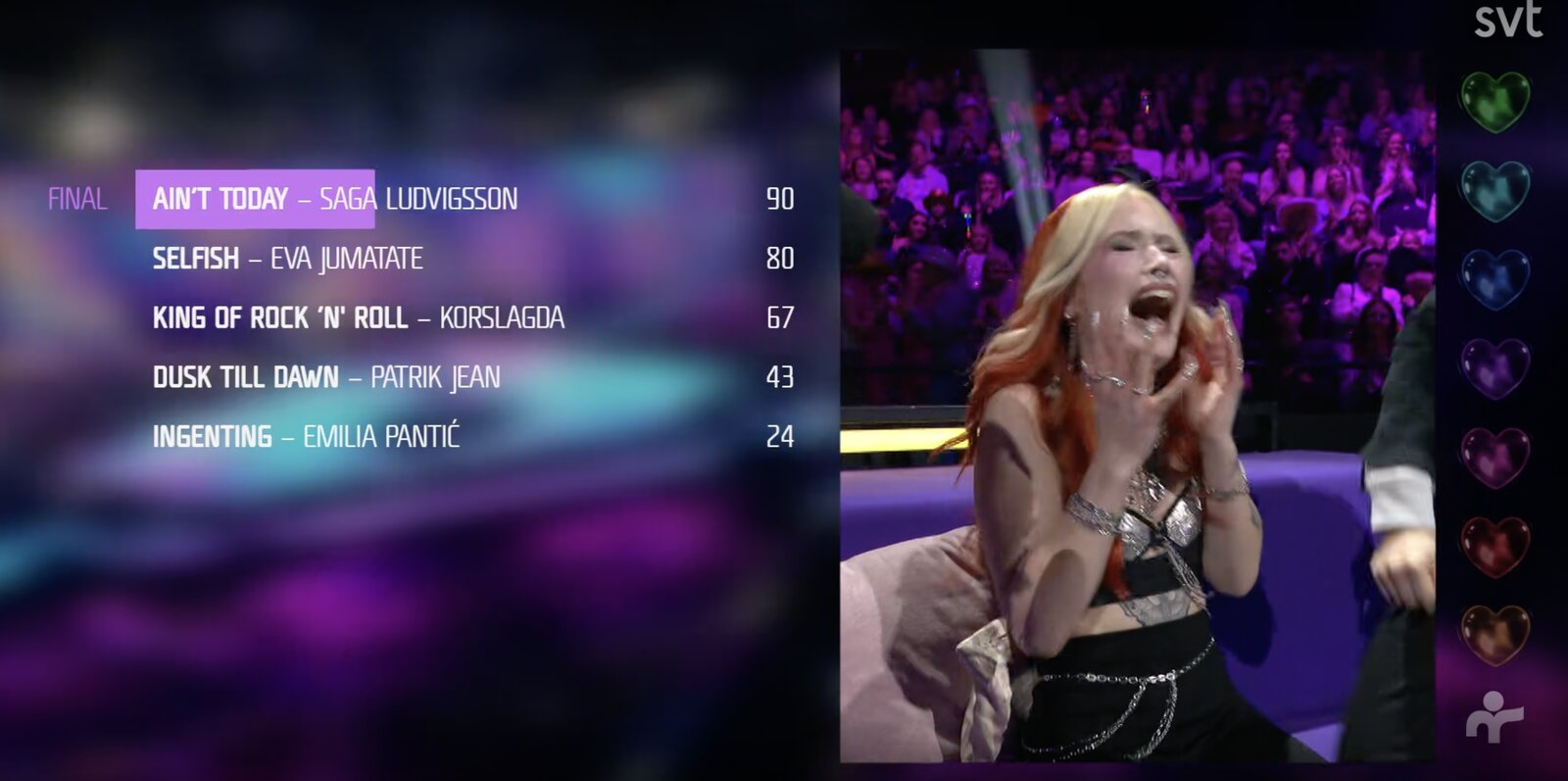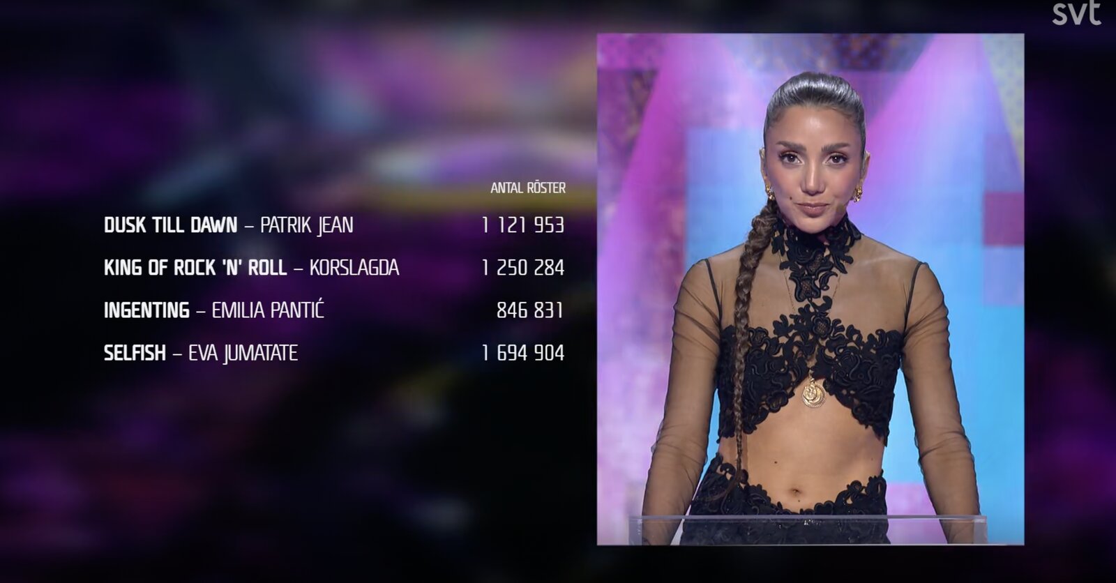 Les votants Radiohjälpen attribuent 12 points aux Kings of rock’n roll. Les 10-15 ans préfèrent Eva Jumatate, les 60-74 ans quant à eux sont pour Saga Ludvigsson, quand les 16-29 ans se sont exprimé pour Eva Jumatate également.