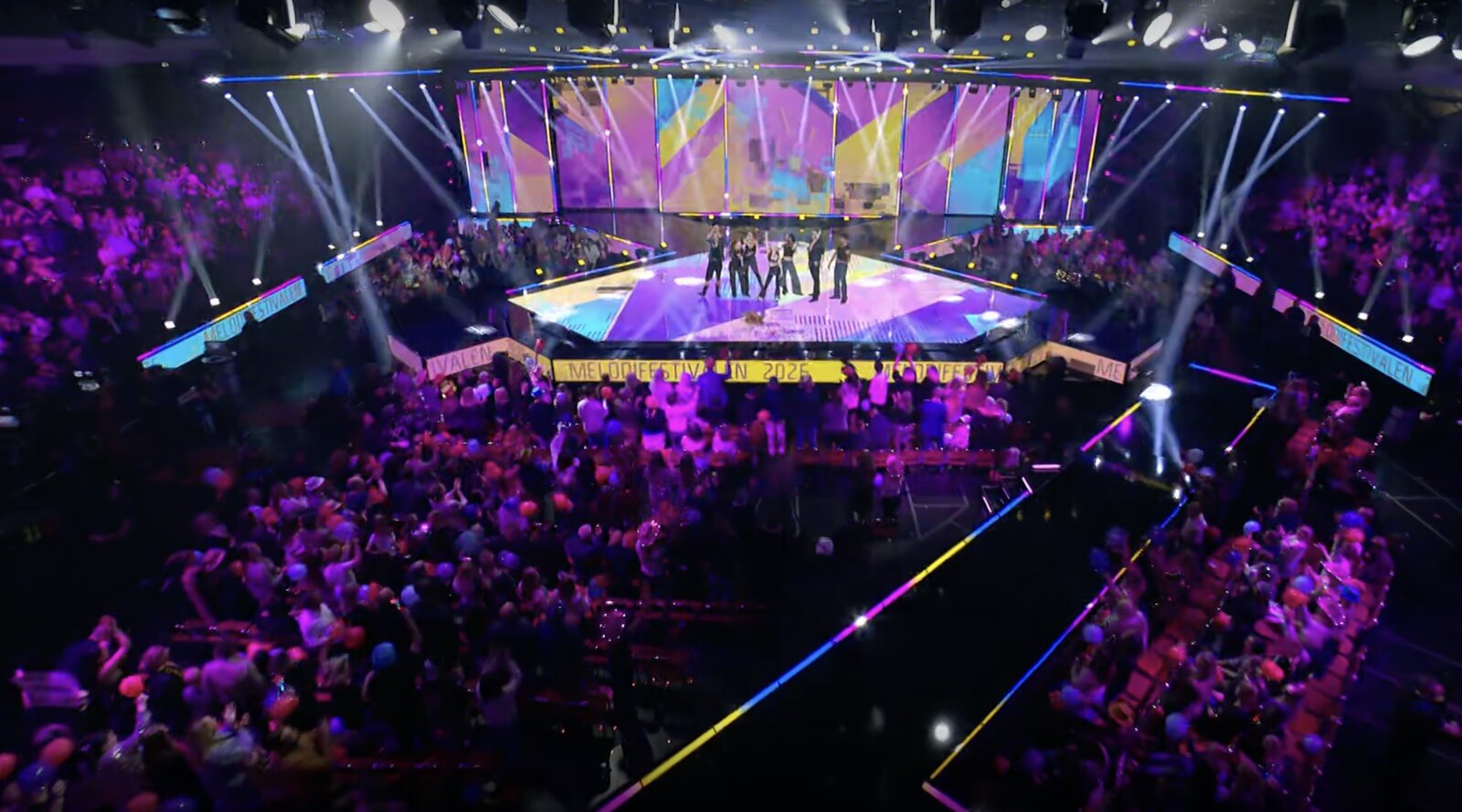 Gina Dirawi et Hampus Nessvold s’adressent aux téléspectateurs devant le visuel aux couleurs pastel et alors que les spots de lumières nous font penser au M du logo du Mello.