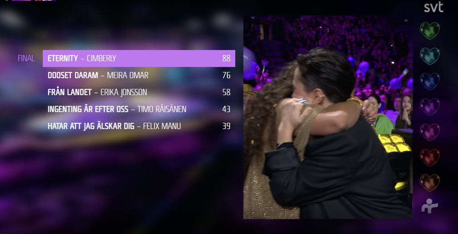 Trois autres artistes (Jacqline, Robin Bengtsson et Eva Jumatate) ont obtenu un ticket seconde chance en sélection finale. Ce soir vers 21h30, trois noms viendront s’ajouter à cette liste.
