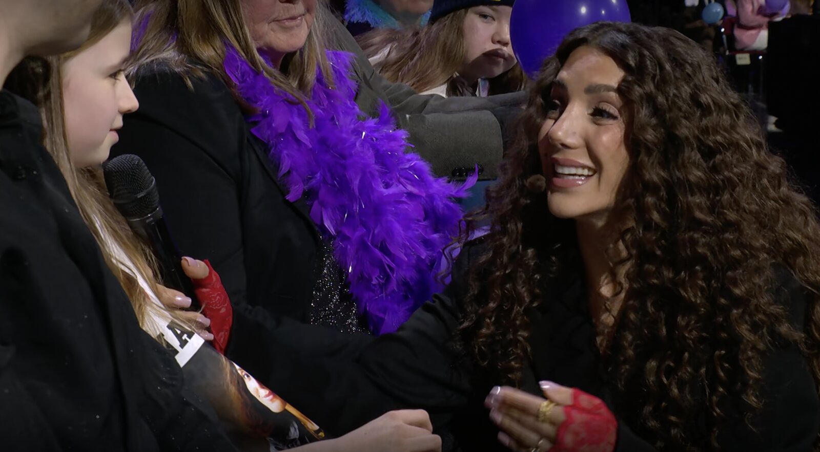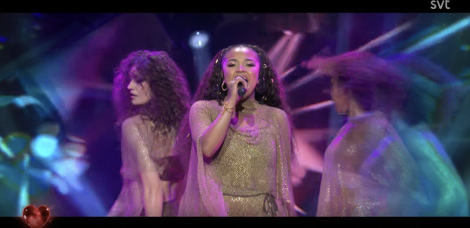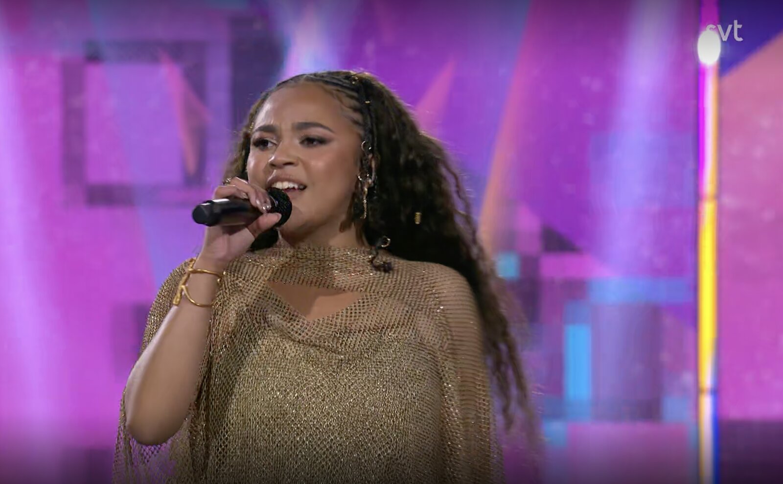 La jeune chanteuse métisse apparaît dans une tenue de scène étincelante, entièrement dorée. Ses cheveux ondulés, agrémentés de bagues, complètent une silhouette soignée et résolument pop.