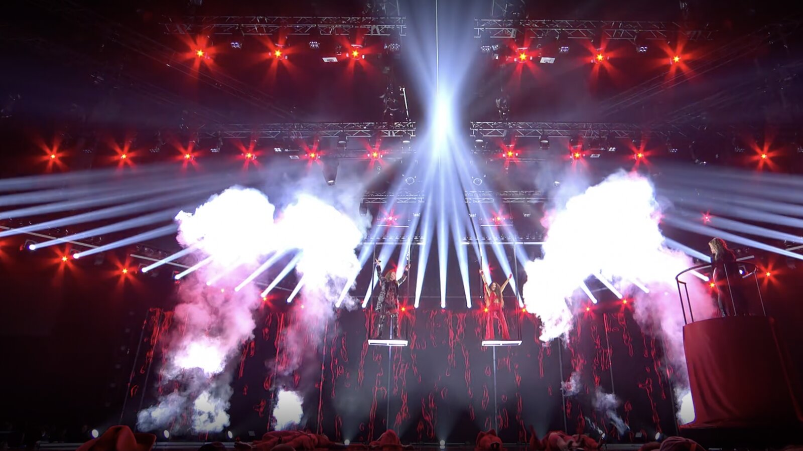 Installée sur une petite scène additionnelle en forme de losange, elle entame sa performance en dansant, avant l’arrivée soudaine et efficace de deux choristes qui viennent se placer à ses côtés. Un déluge de lumières accompagne alors le numéro, marqué par des effets lumineux façon diamant.