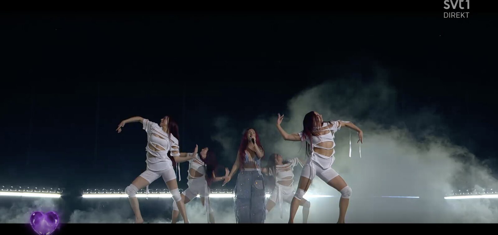 Sur scène, elle dévoile un nombril nu et un bras tatoué. D’abord au sol, pieds nus, elle évolue dans une atmosphère enveloppée de fumée. Une danseuse la rejoint, puis une seconde, toutes deux vêtues de blanc.
