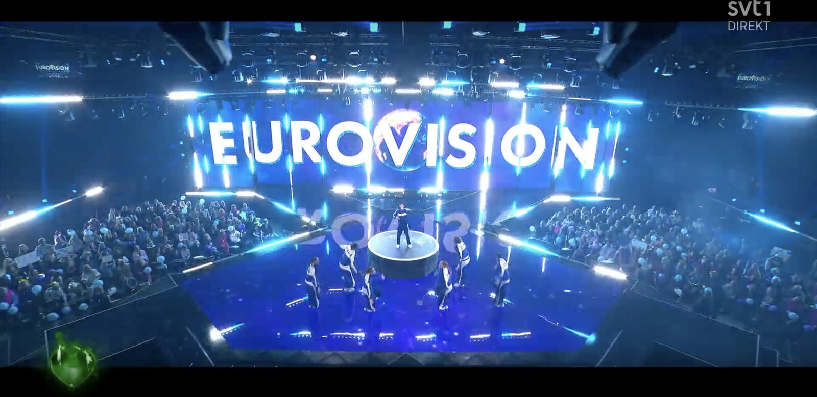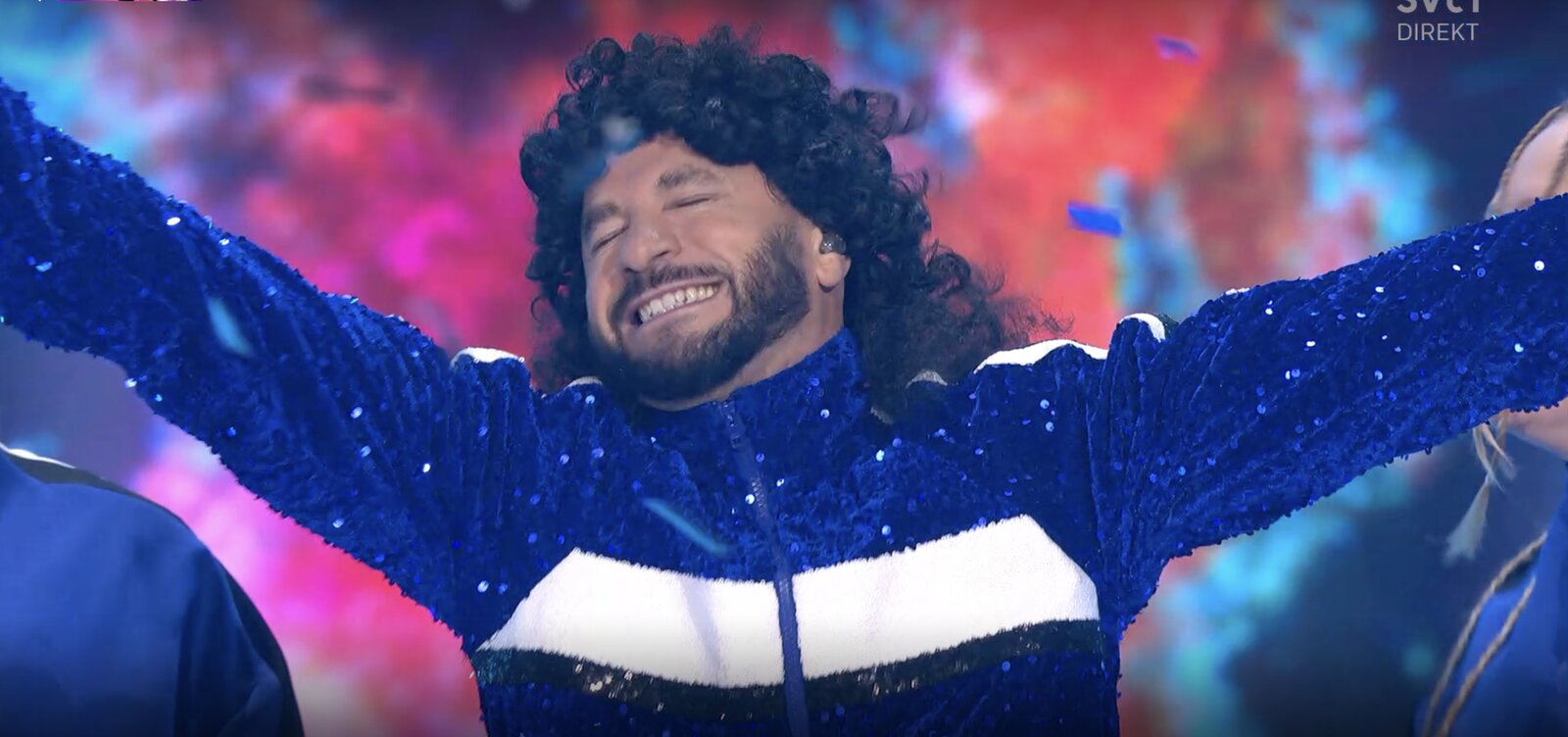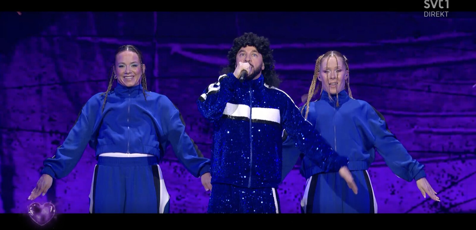Derrière lui, un visuel composé de dessins blancs qui défilent en continu. L’ensemble est festif, dansant, volontairement kitsch. Le mot « Eurovision » s’affiche à plusieurs reprises à l’écran, comme un clin d’œil appuyé au concours.