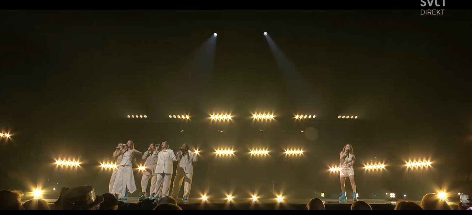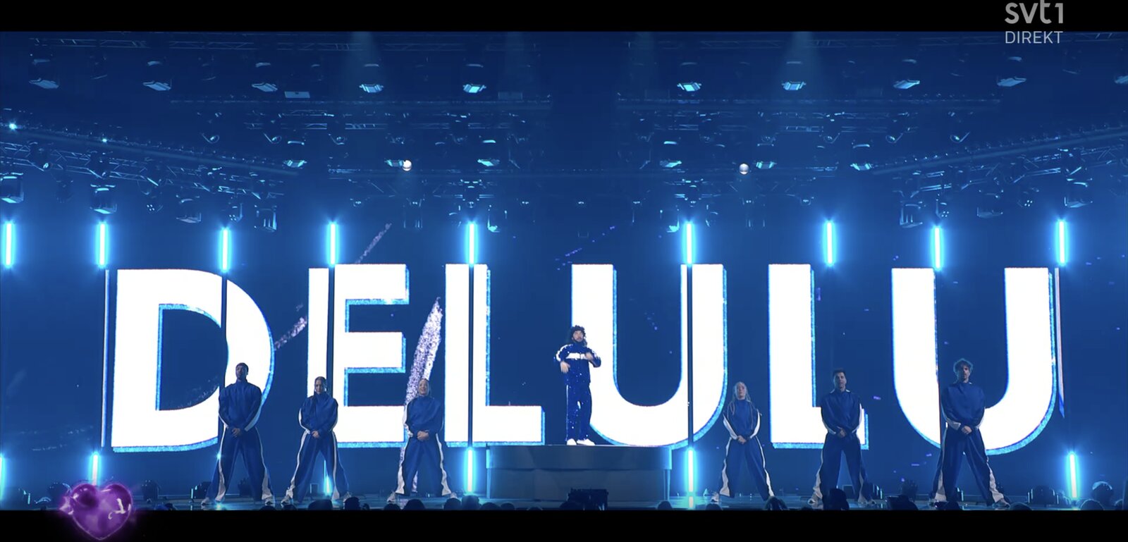 Hampus Nessvold annonce une place « Direkt till final » pour Lilla Al-Fadji, qui interprète de nouveau son titre « Delulu », bientôt rejoint par ses six danseurs.