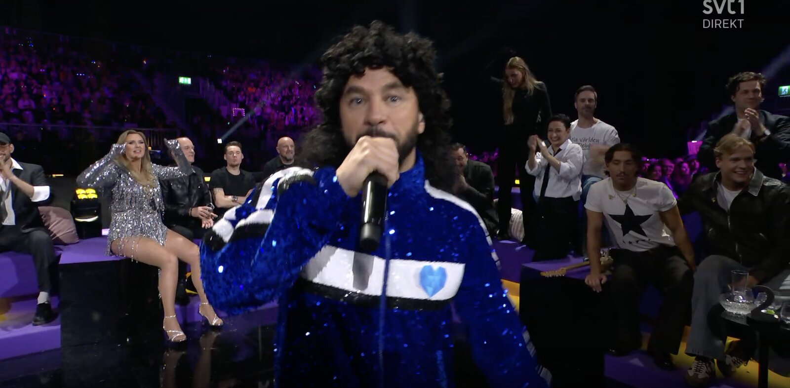 Il descend dans le public, multiplie les interactions, puis file en green room où il interpelle AleXa, Juliett et Sanna Nielsen, semant la pagaille bon enfant.
