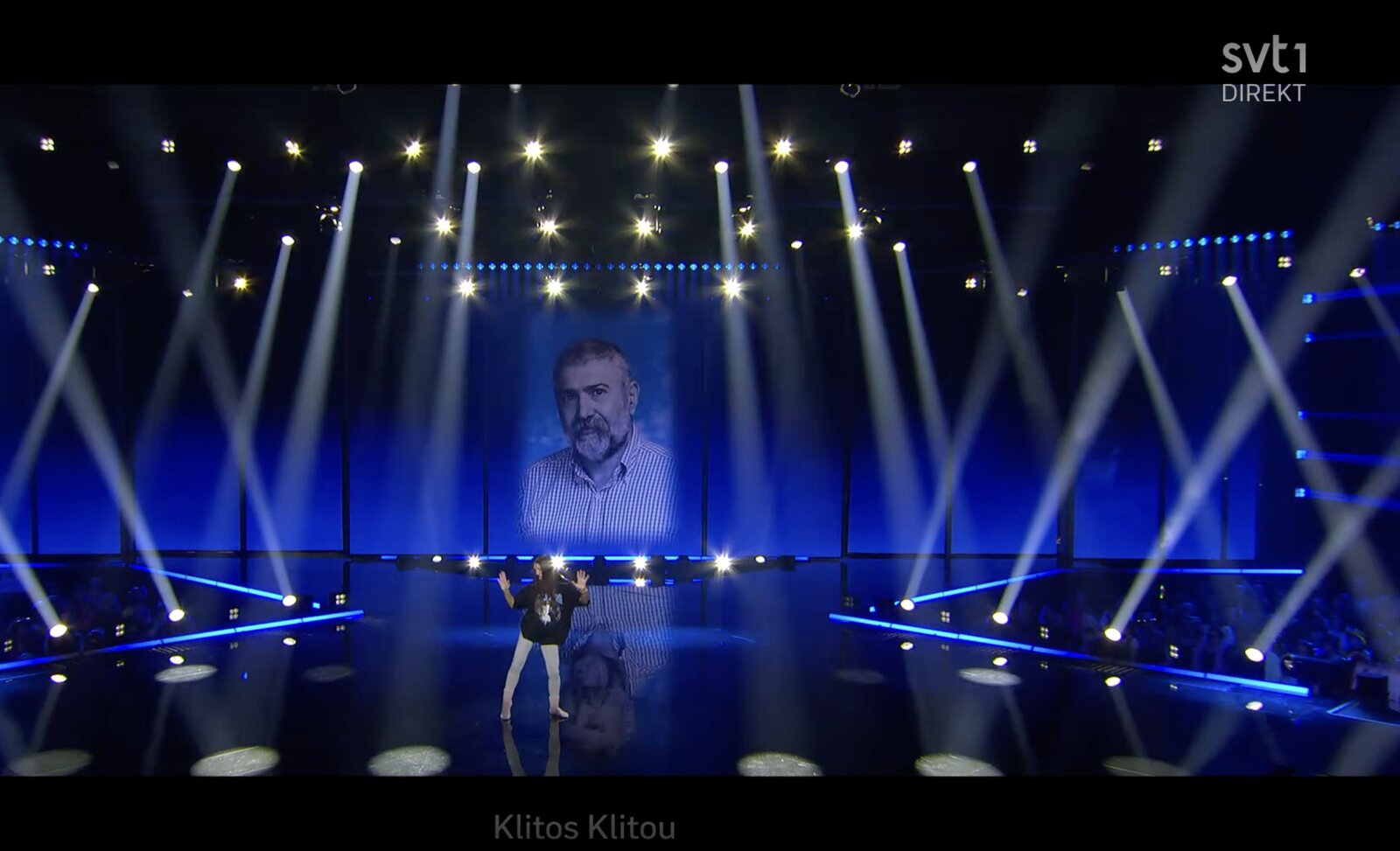 Vêtue d’un legging, dans un style presque adolescent, elle est portée par un danseur - lequel arbore un masque au visage de Klitos Klitou. Son portrait apparaît en grand sur l’écran en fond de scène pour le final.