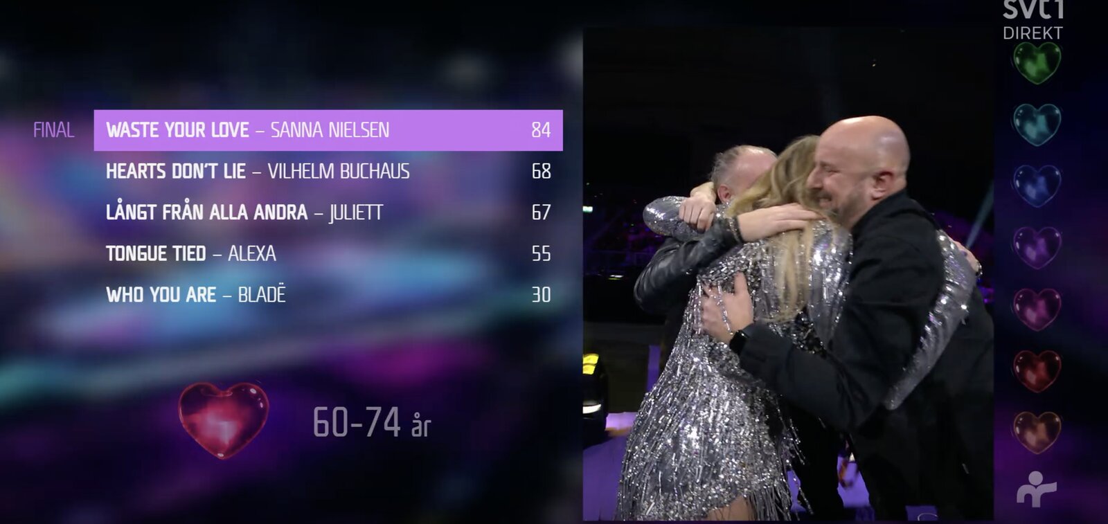 Radiohjälpen ont aussi voté massivement pour Sanna Nielsen, les 60/74 ans se sont exprimé en faveur de Sanna Nielsen également