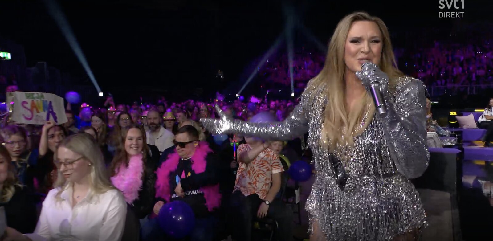 Sanna Nielsen apparaît dans une tenue glitter argentée, éclatante sous les projecteurs.