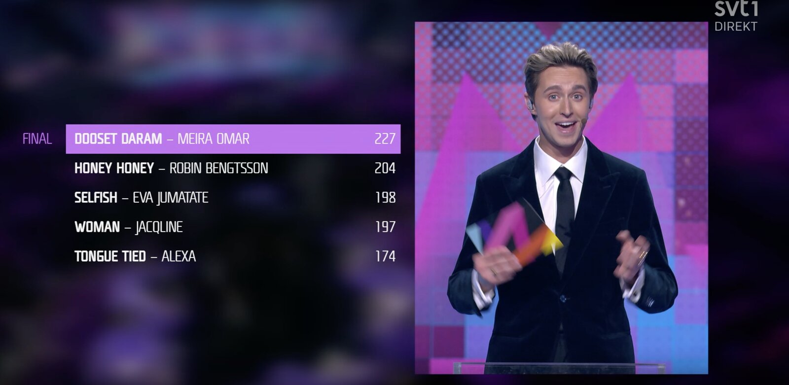 L’émission se déroule à Sundsvall, au centre de la Suède, et nous visionnons le stream sur SVTplay.
