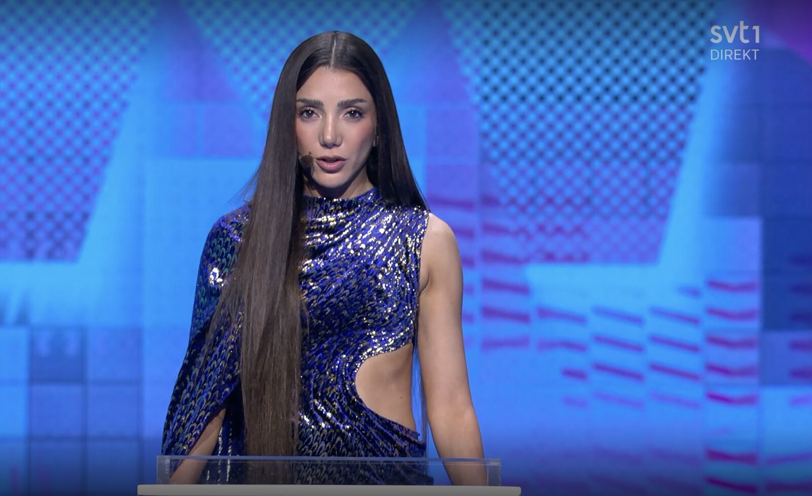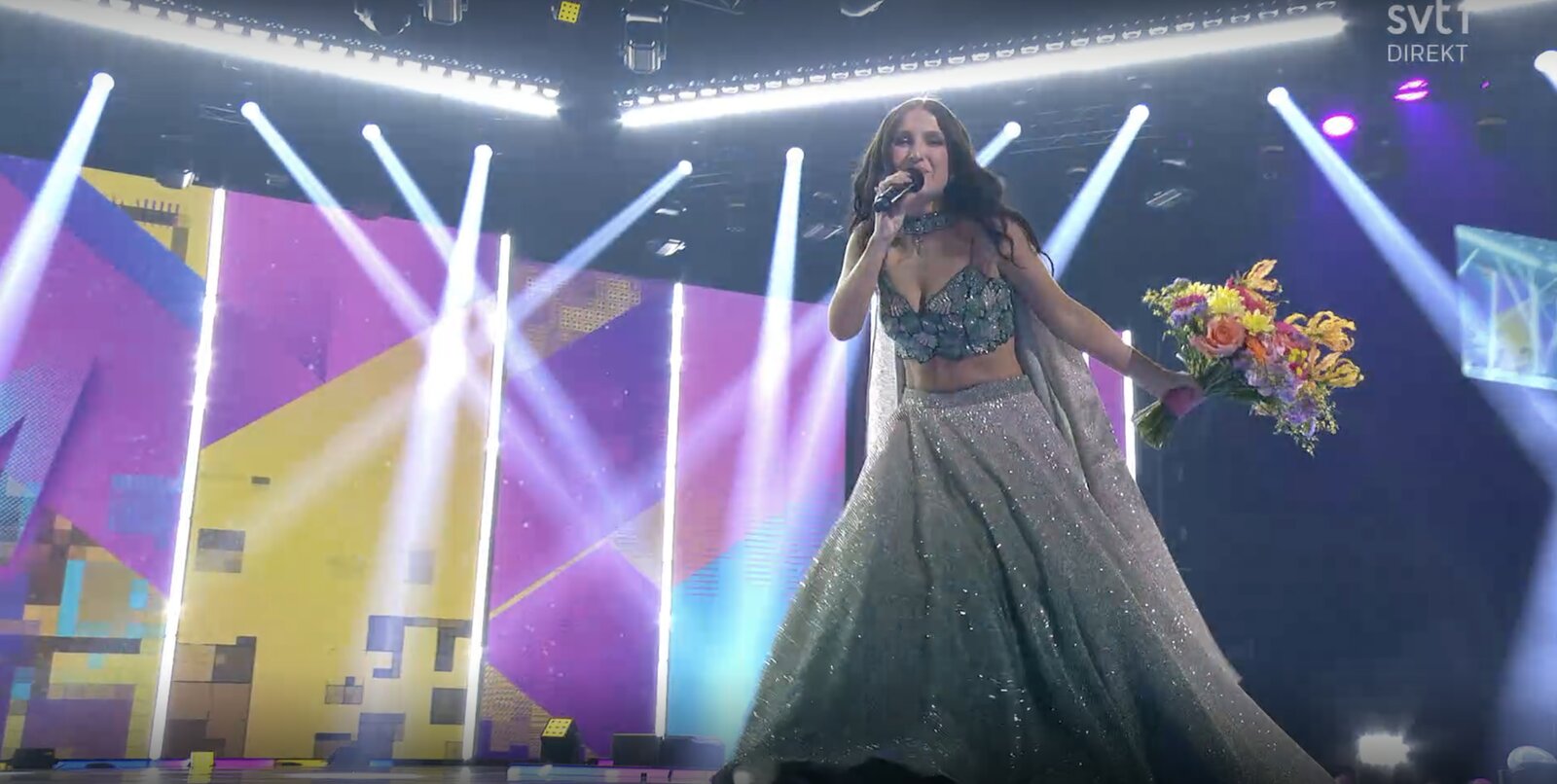 On découvre également le look de Sanna Nielsen : des gants argentés qui captent la lumière et de longues jambes laissées nues, pour une silhouette élégante et affirmée.