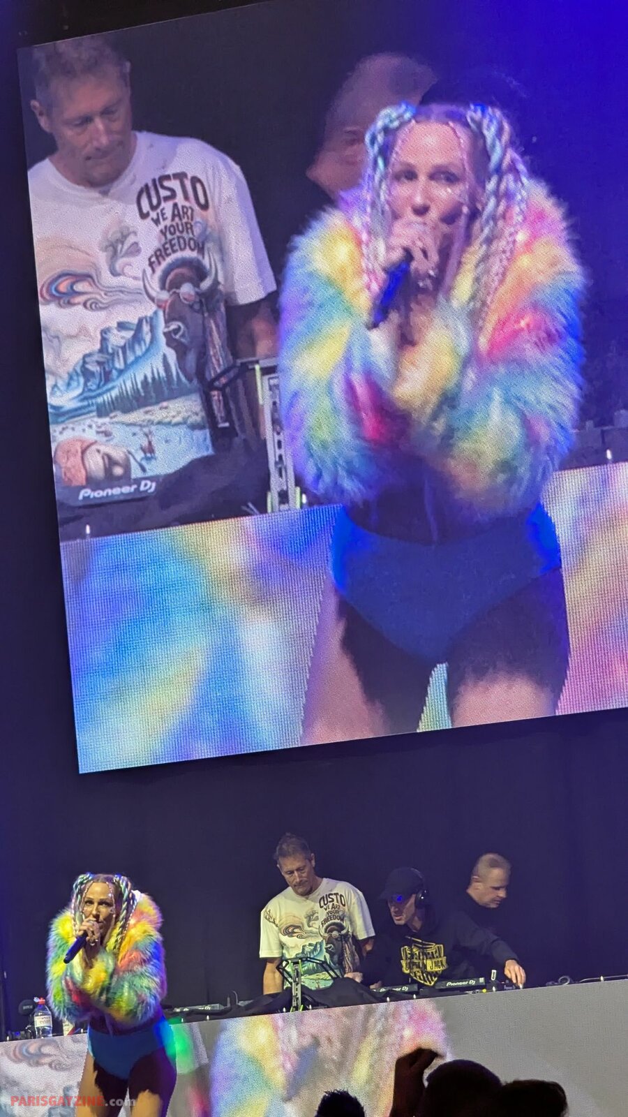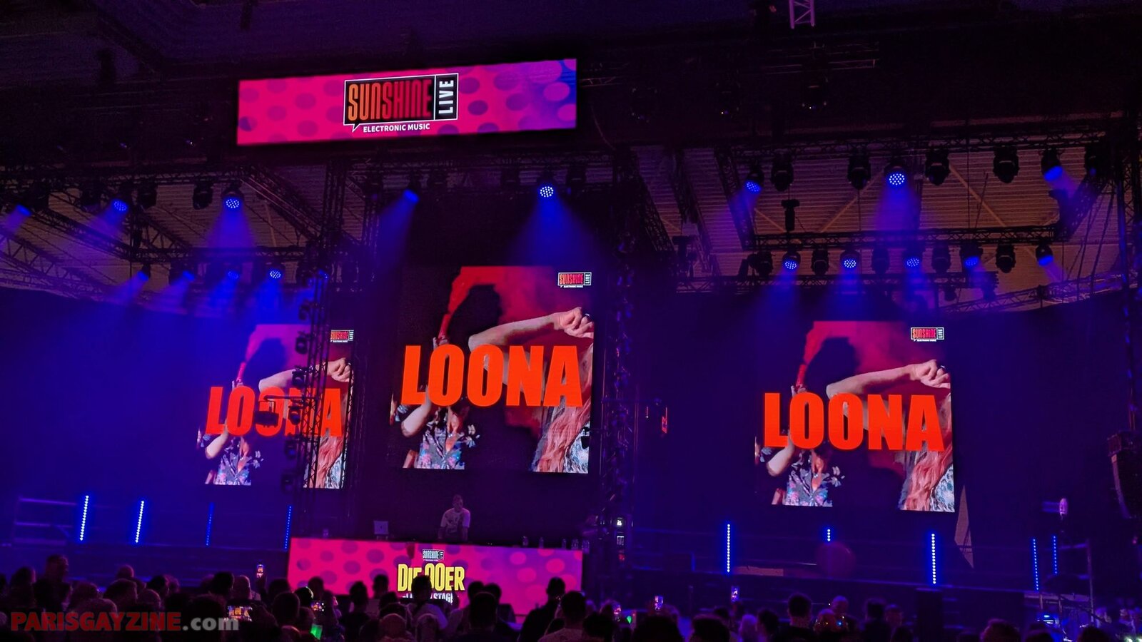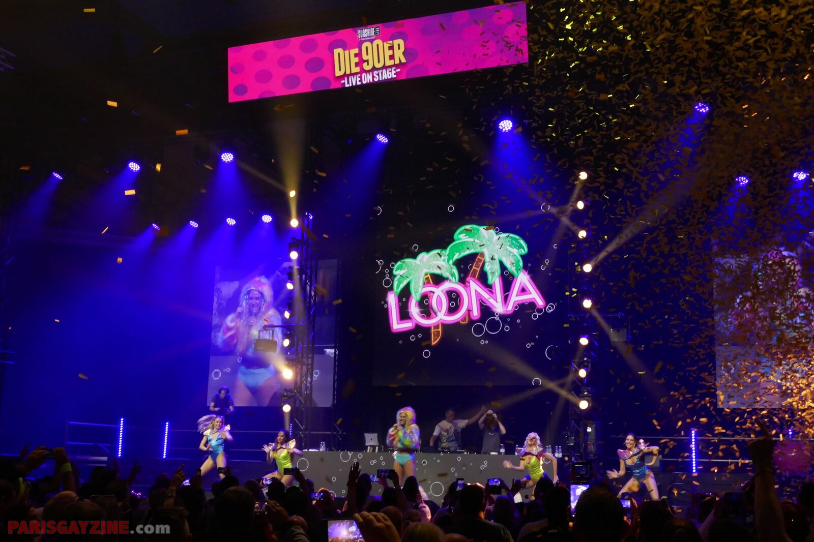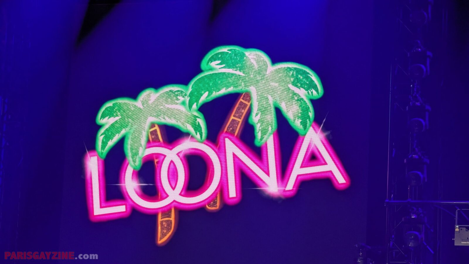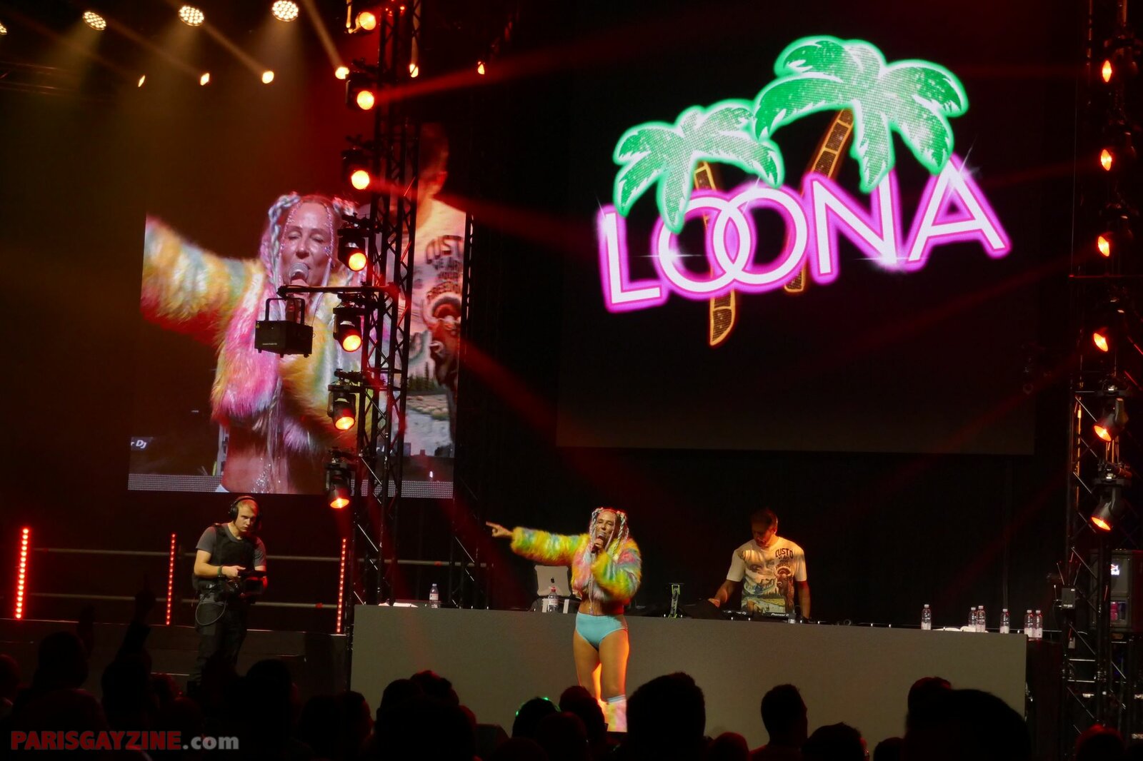 Véritable boule d’énergie et de fun, elle évolue sur scène vêtue d’un maillot de bain bleu turquoise, porté sous un manteau en fausse fourrure fluo aux manches pelucheuses aux couleurs de l’arc-en-ciel. Entourée de quatre danseuses scintillantes, sur fond de logo Loona flanqué de deux palmiers, elle maintient le public en ébullition.