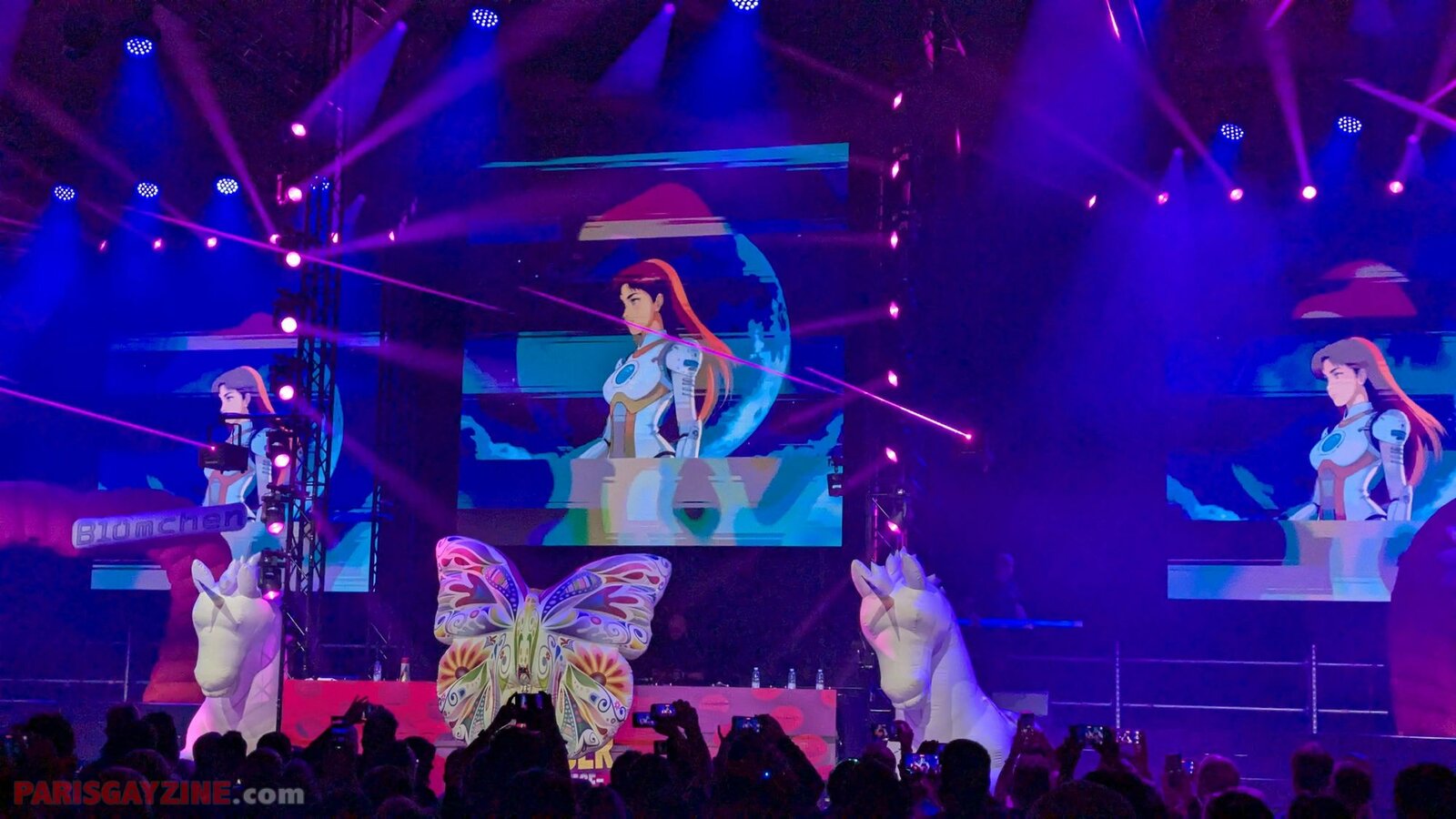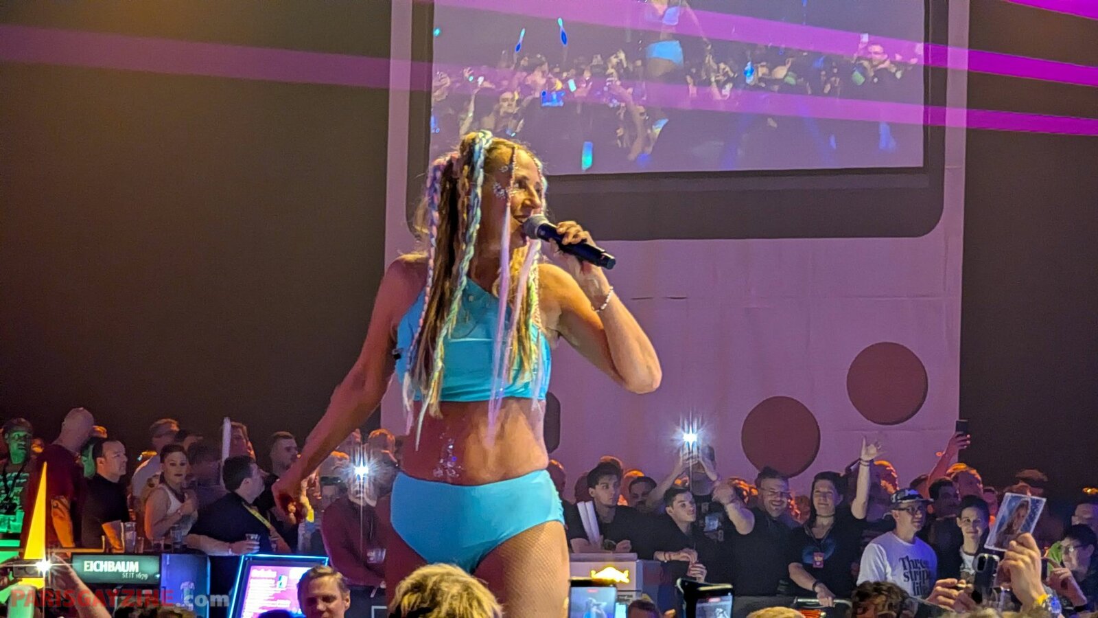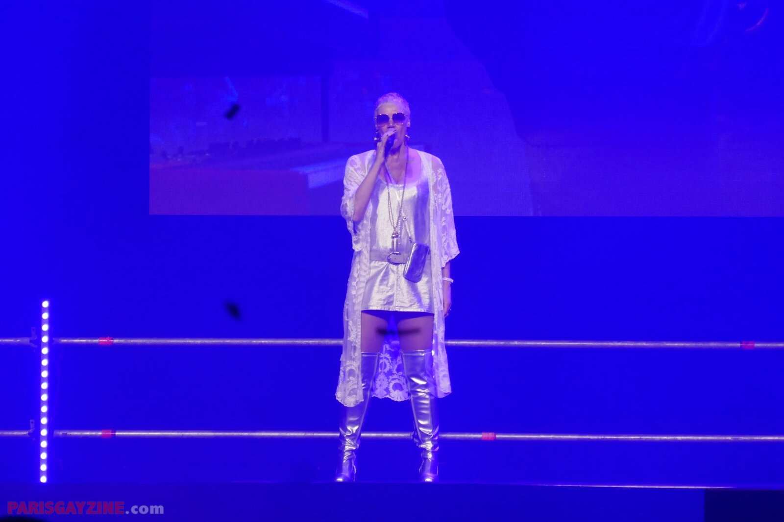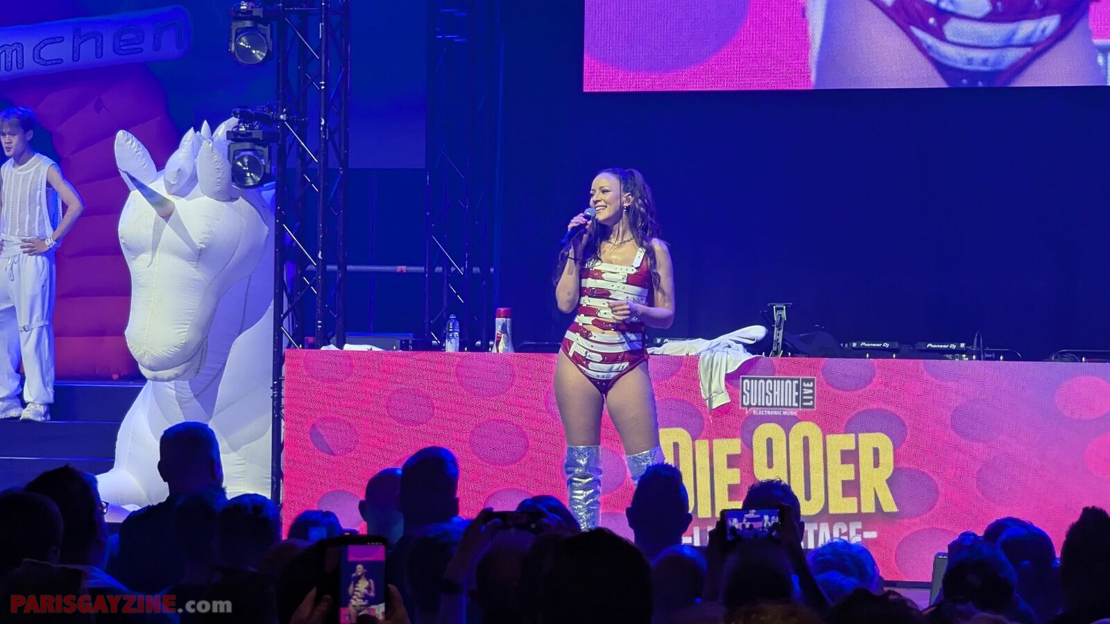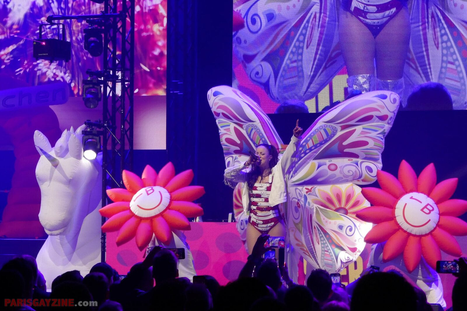 Véritable boule d’énergie et de fun, elle évolue sur scène vêtue d’un maillot de bain bleu turquoise, porté sous un manteau en fausse fourrure fluo aux manches pelucheuses aux couleurs de l’arc-en-ciel. Entourée de quatre danseuses scintillantes, sur fond de logo Loona flanqué de deux palmiers, elle maintient le public en ébullition.