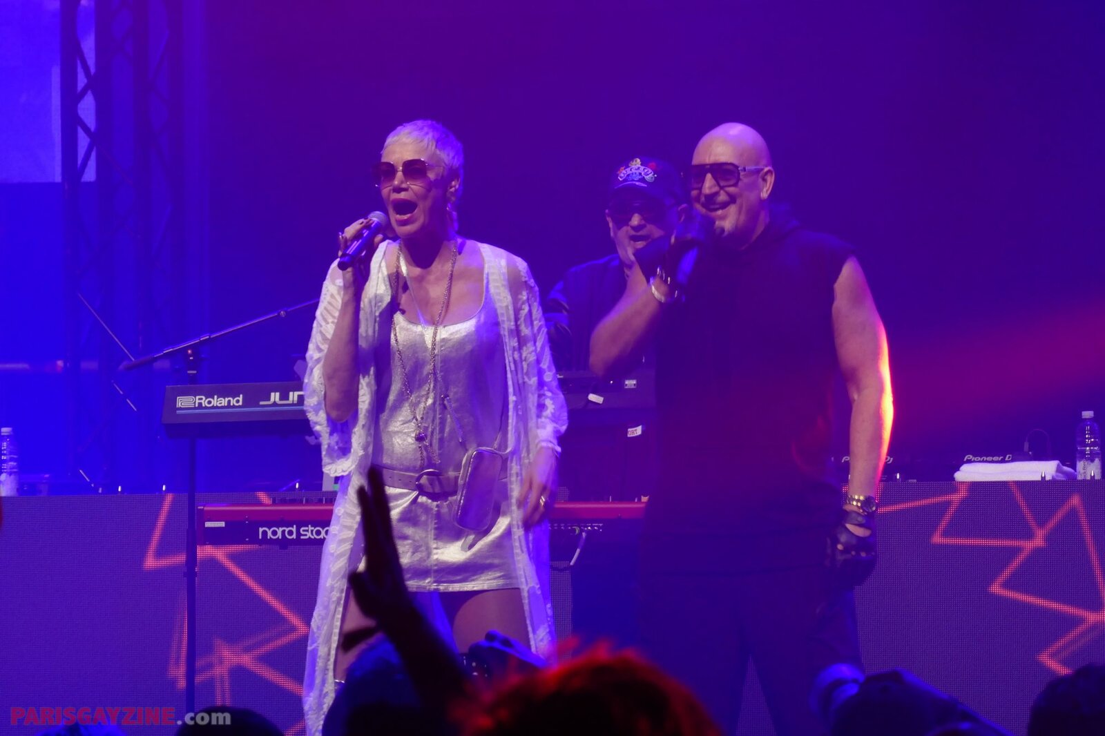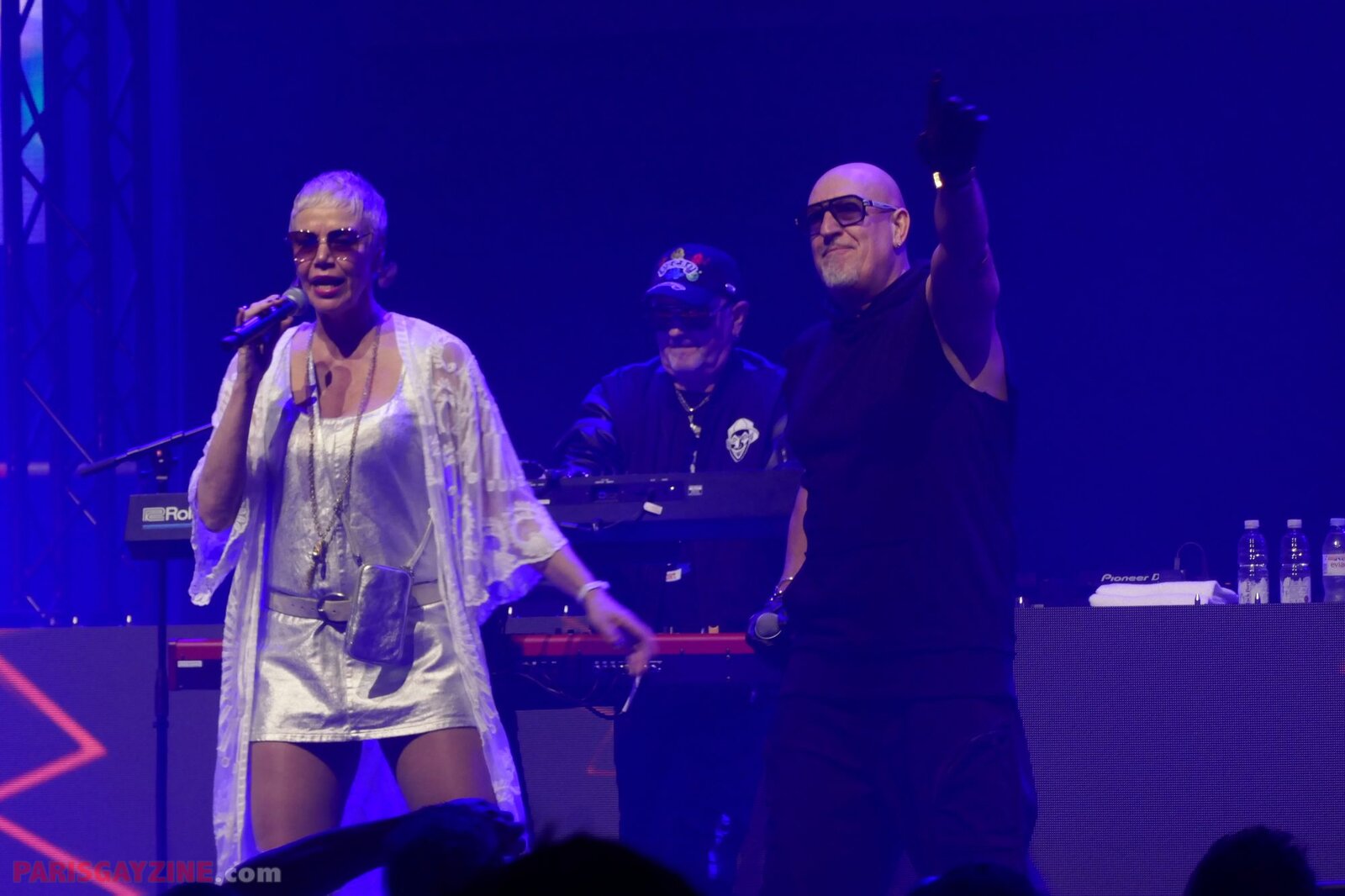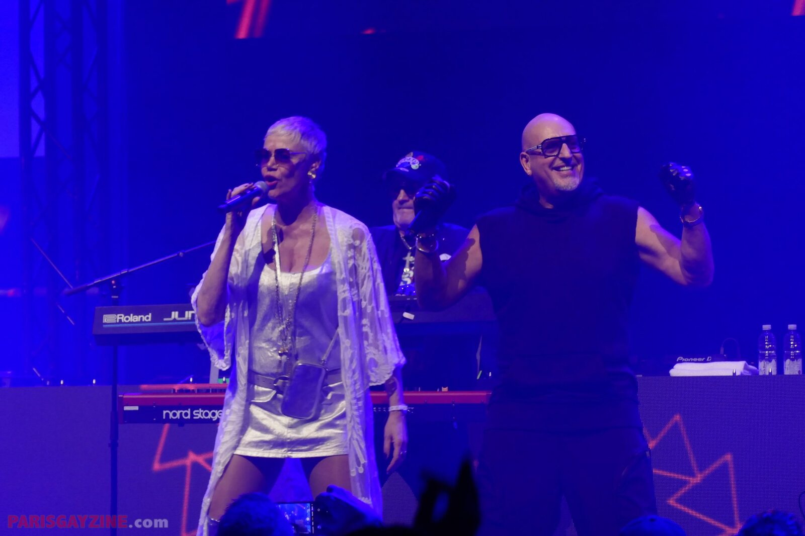 La chanteuse tout en strass et body noir, et ses deux compères vêtus en blanc, enchaînent avec Sweet kisses 2025 sur le même tempo dance, puis avec le beaucoup plus pop Saturday night, qui n’est pas une reprise de Whigfield mais un de leur single sorti en 1997.