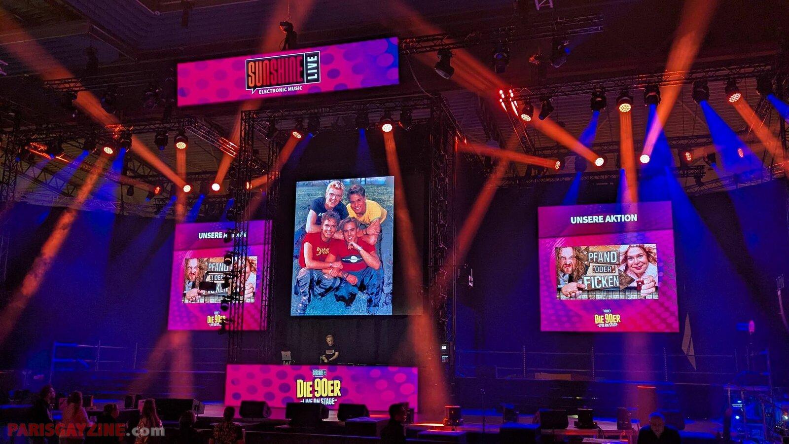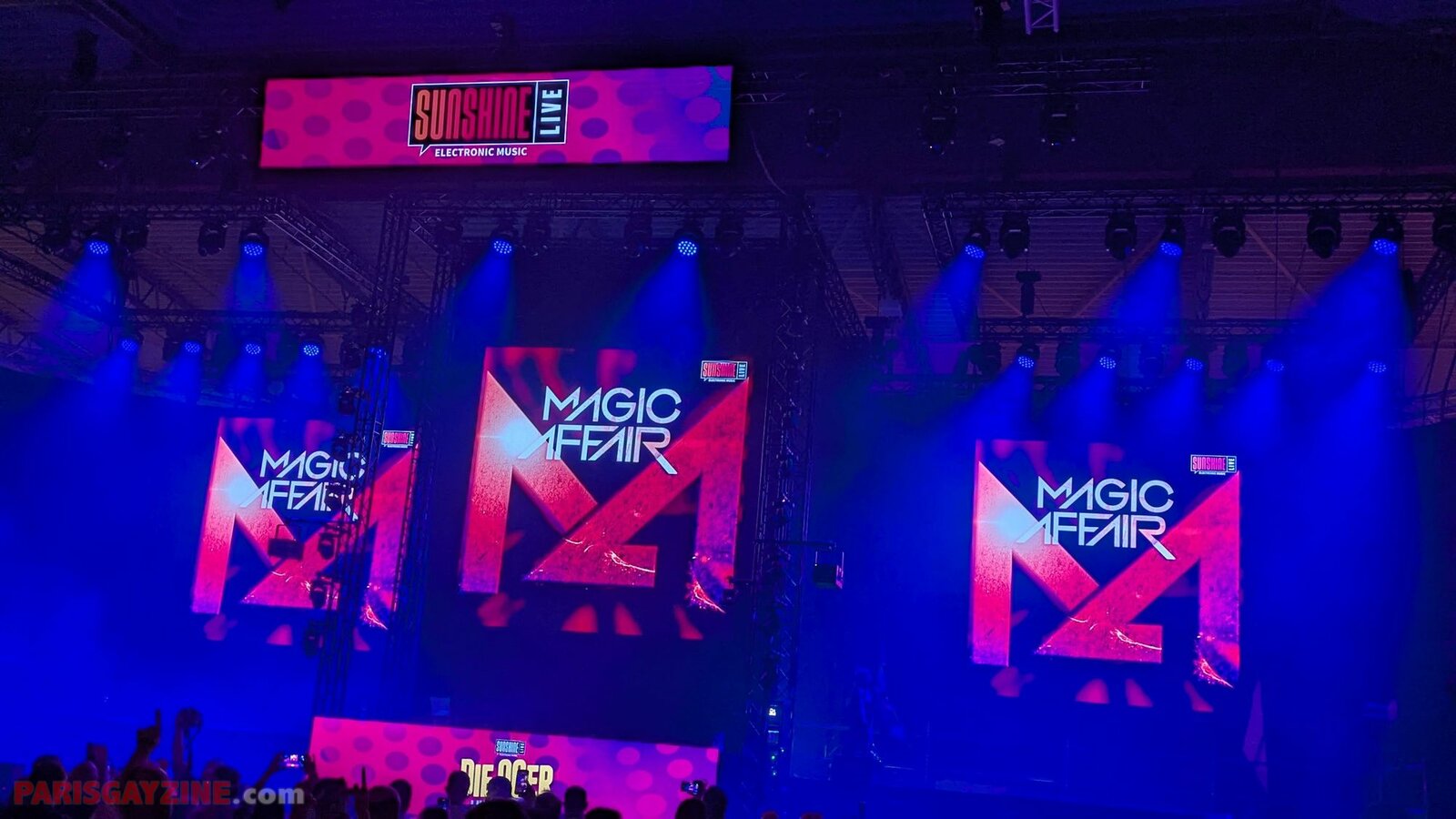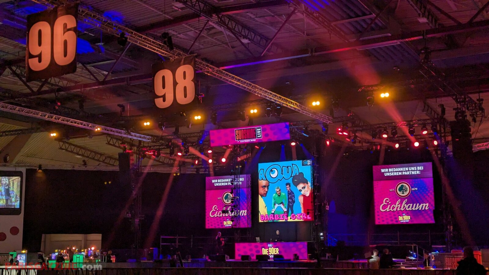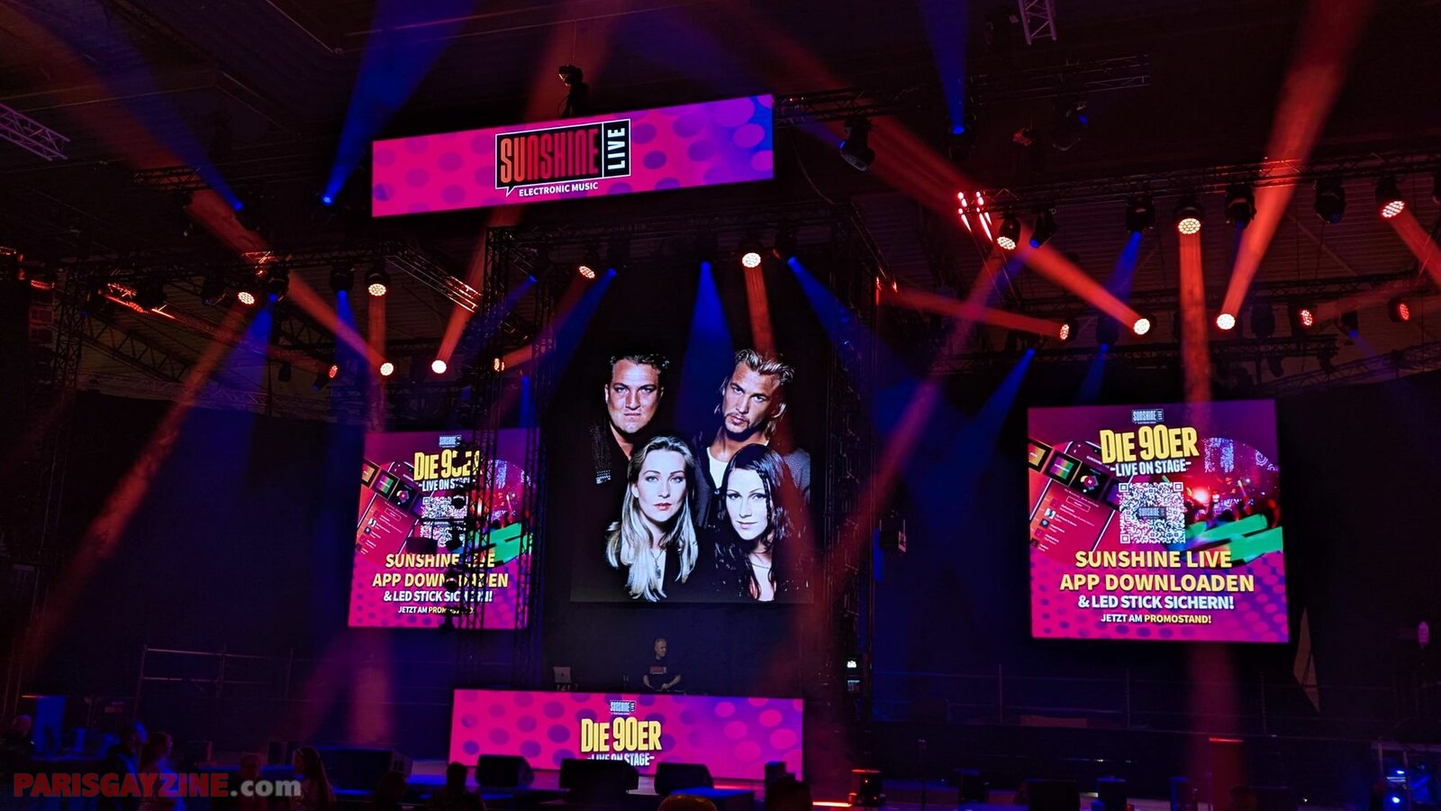 22h02 Le logo de Magic Affair apparaît sur la scène de Die 90er live on stage. Deux personnages géants, vêtus de noir et constellés de LEDs vertes, font leur entrée sur scène. L’introduction démarre sur un son puissant, tandis que des lasers quadrillent la Maimarkthalle. Deux jeunes femmes agitent des drapeaux à l’effigie du groupe. Sur les platines, un long panneau affiche le logo vert de Magic Affair.