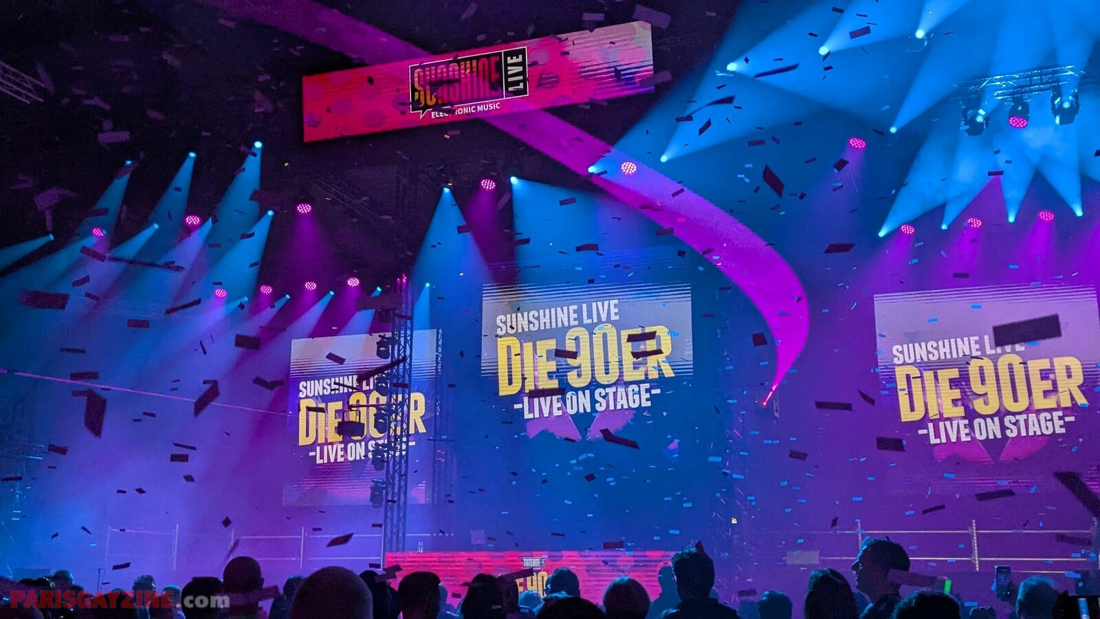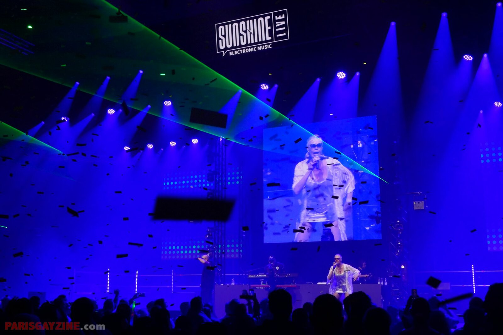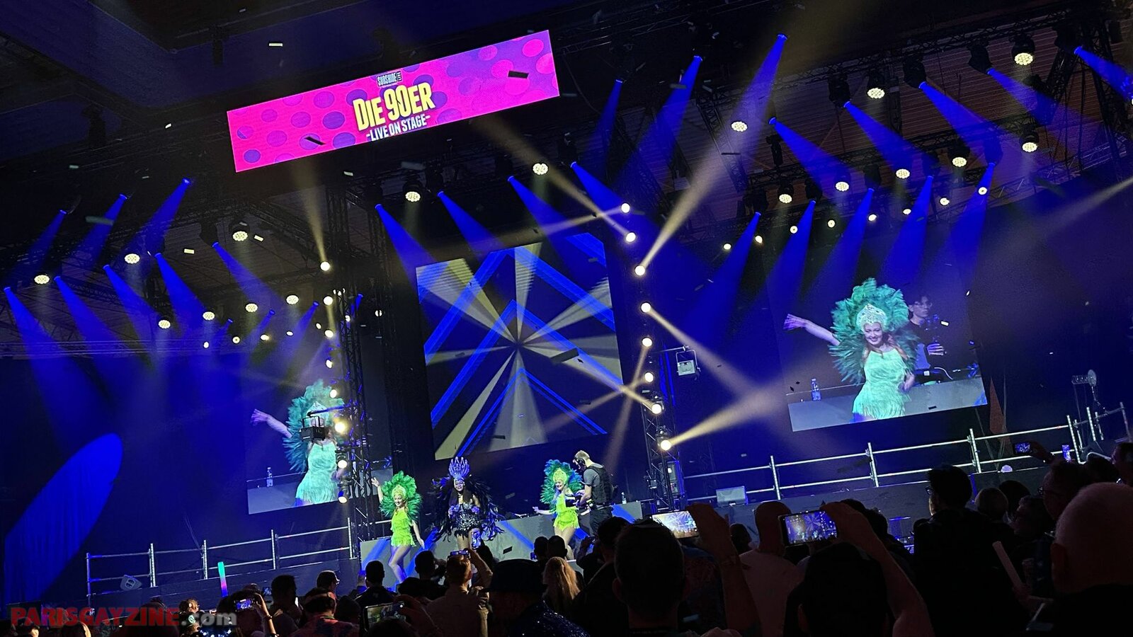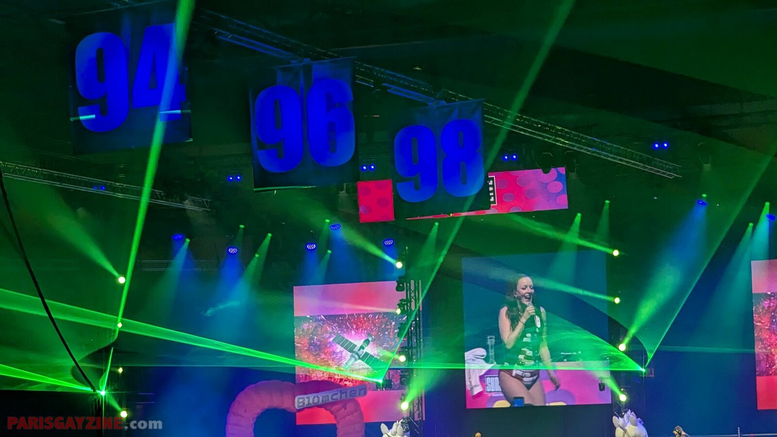 22h02 Le logo de Magic Affair apparaît sur la scène de Die 90er live on stage. Deux personnages géants, vêtus de noir et constellés de LEDs vertes, font leur entrée sur scène. L’introduction démarre sur un son puissant, tandis que des lasers quadrillent la Maimarkthalle. Deux jeunes femmes agitent des drapeaux à l’effigie du groupe. Sur les platines, un long panneau affiche le logo vert de Magic Affair.