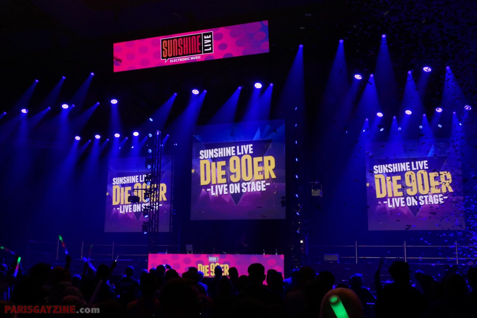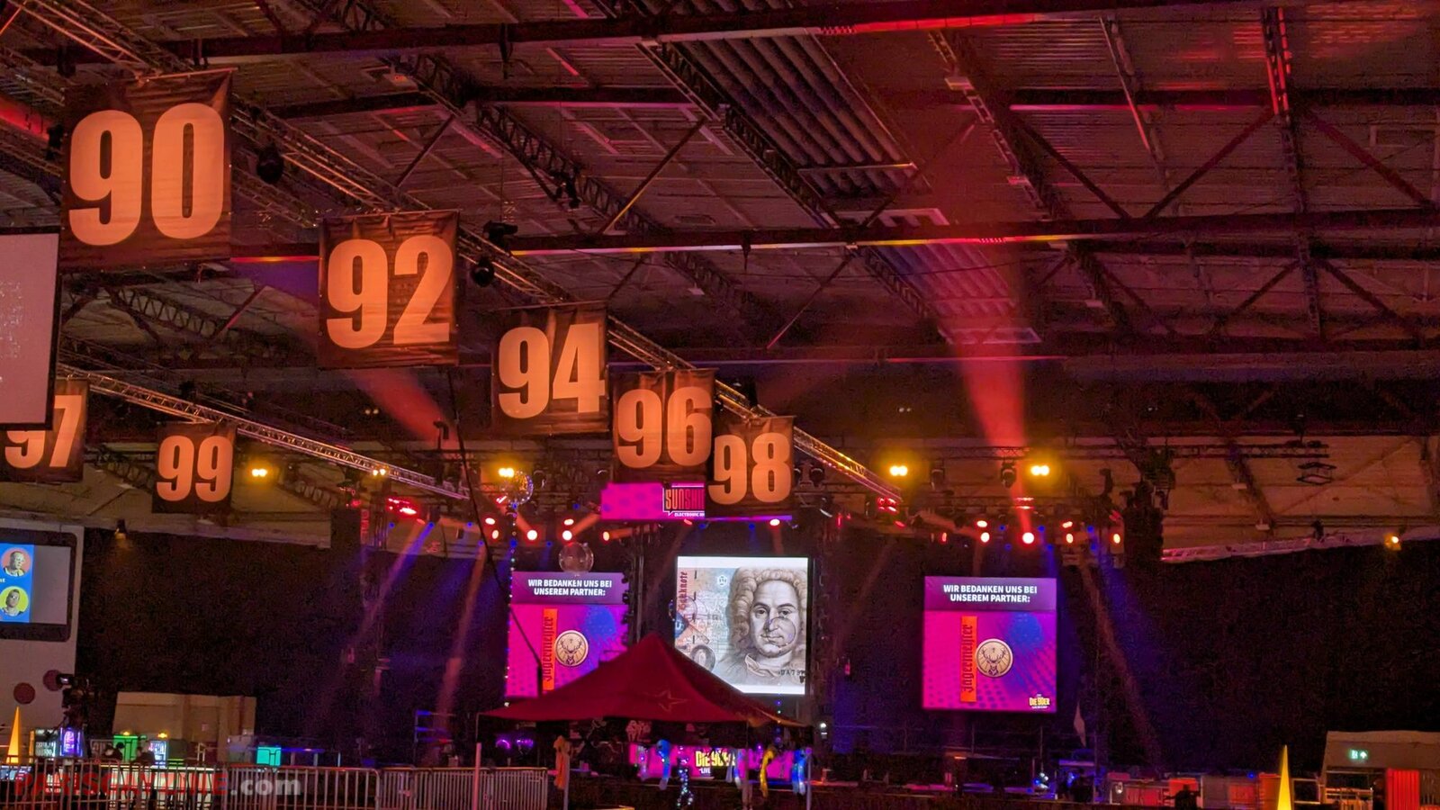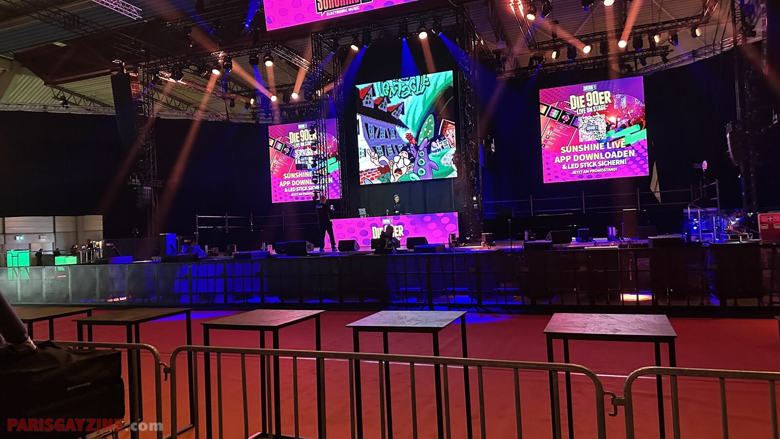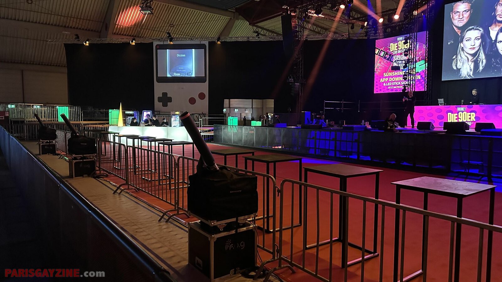 22h02 Le logo de Magic Affair apparaît sur la scène de Die 90er live on stage. Deux personnages géants, vêtus de noir et constellés de LEDs vertes, font leur entrée sur scène. L’introduction démarre sur un son puissant, tandis que des lasers quadrillent la Maimarkthalle. Deux jeunes femmes agitent des drapeaux à l’effigie du groupe. Sur les platines, un long panneau affiche le logo vert de Magic Affair.