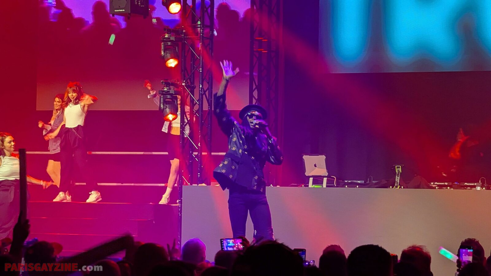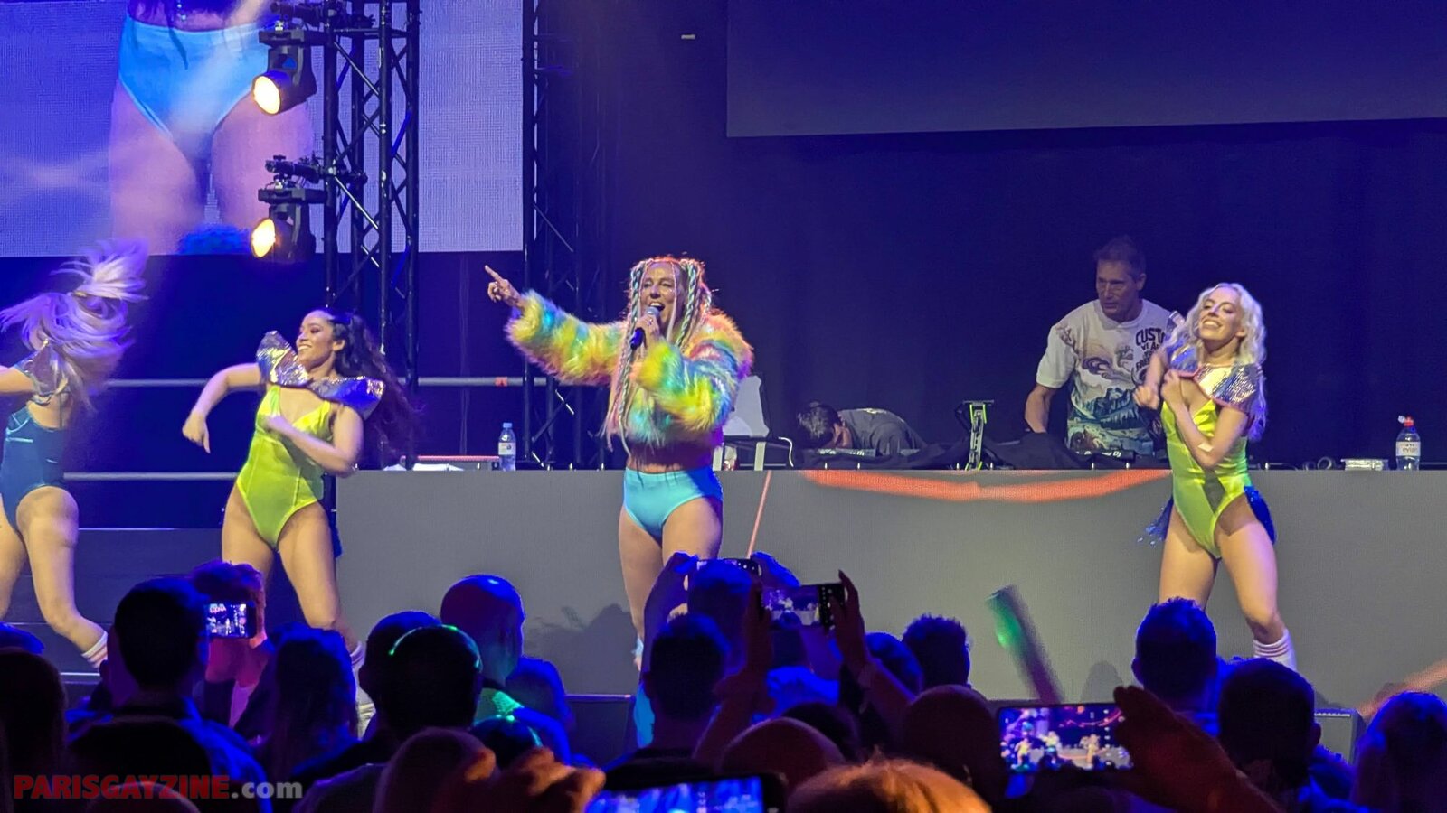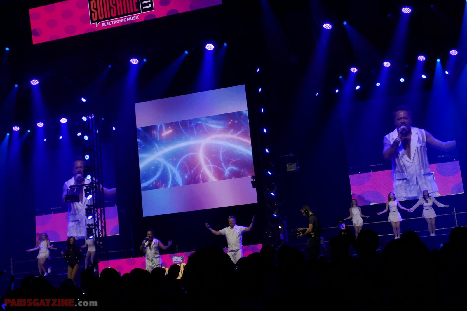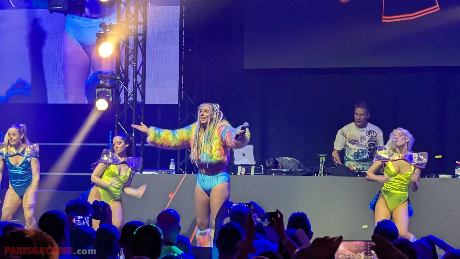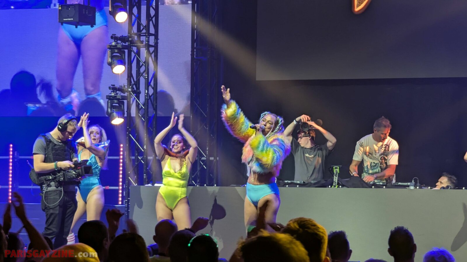 À l’arrière de la scène, quatre danseuses viennent s’ajouter aux deux déjà présentes, accentuant l’énergie visuelle du show.