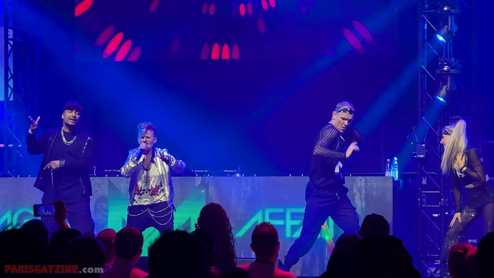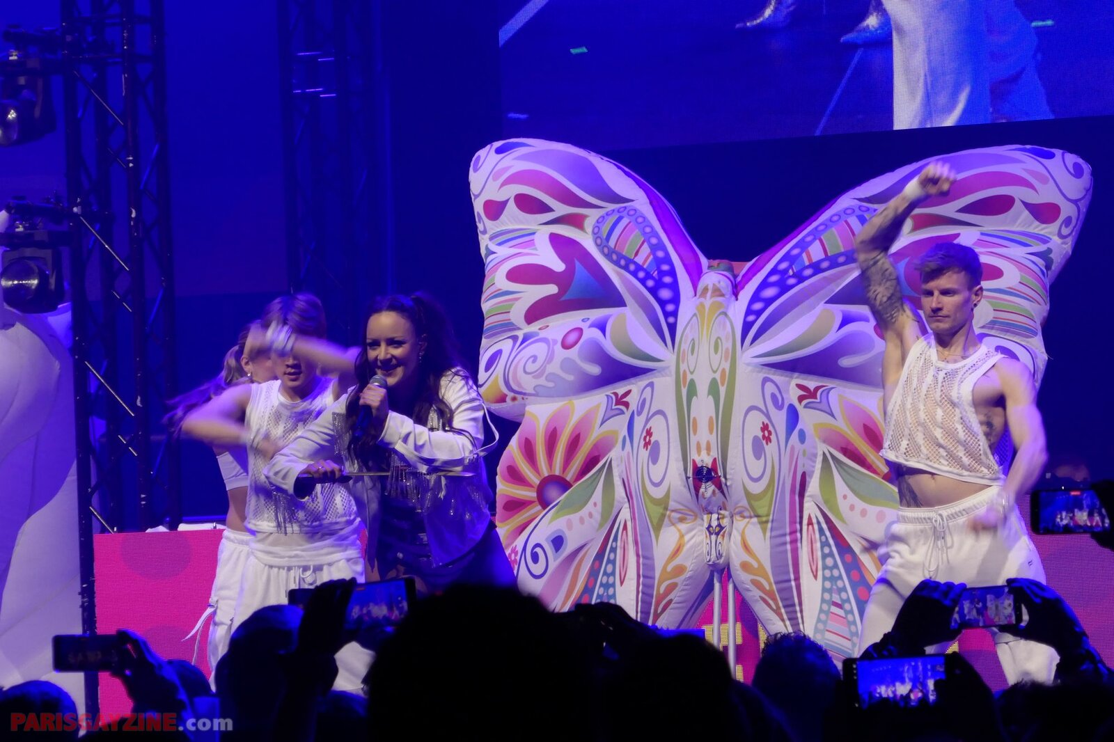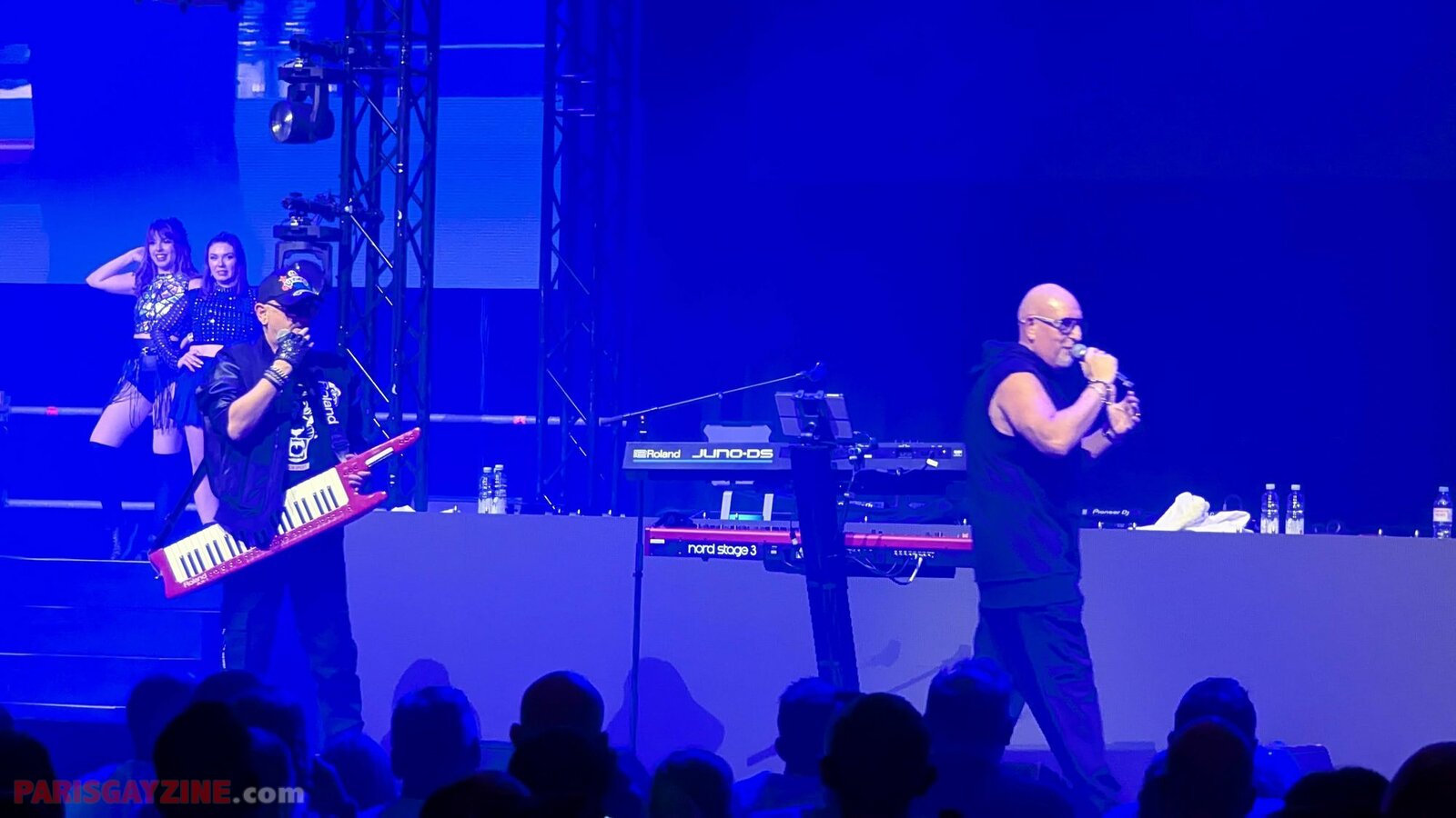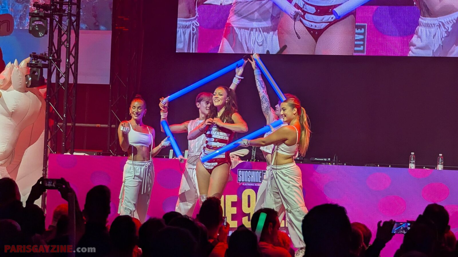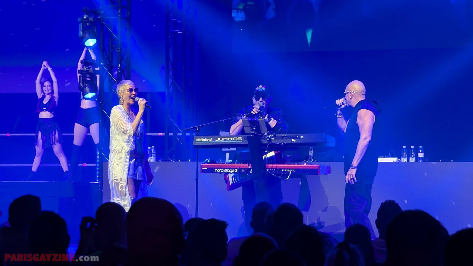 À l’arrière de la scène, quatre danseuses viennent s’ajouter aux deux déjà présentes, accentuant l’énergie visuelle du show.
