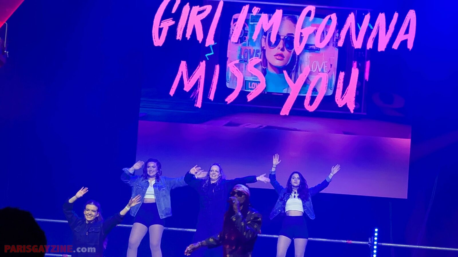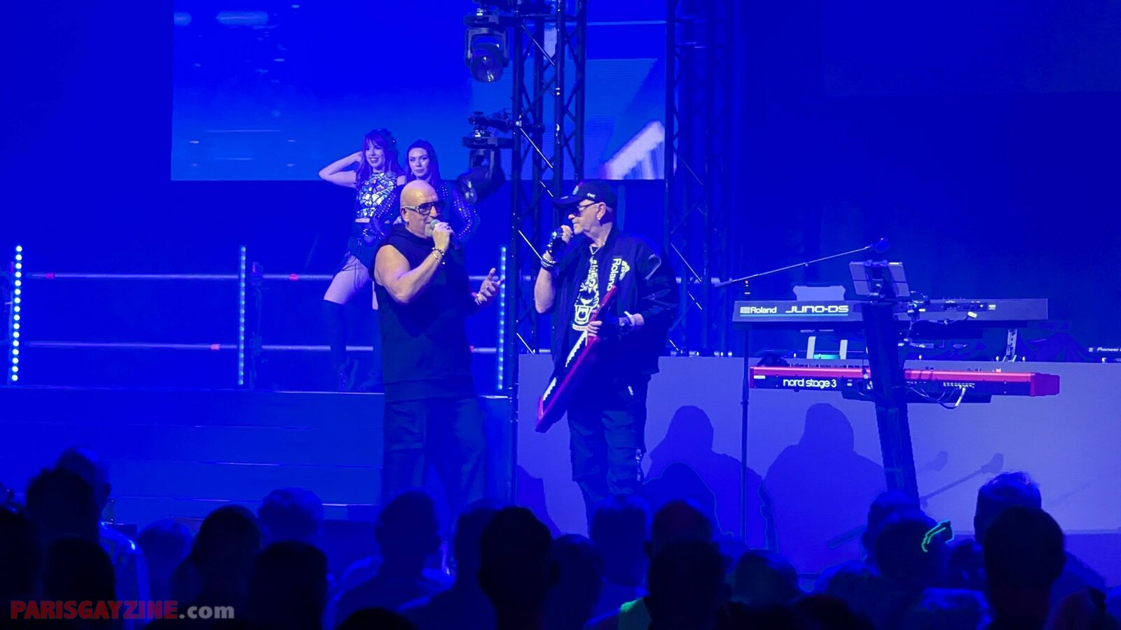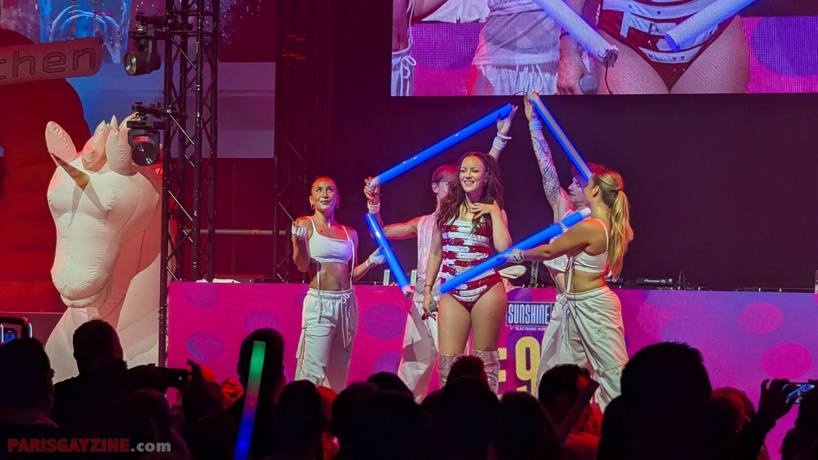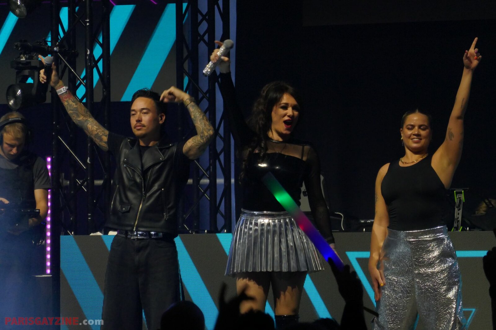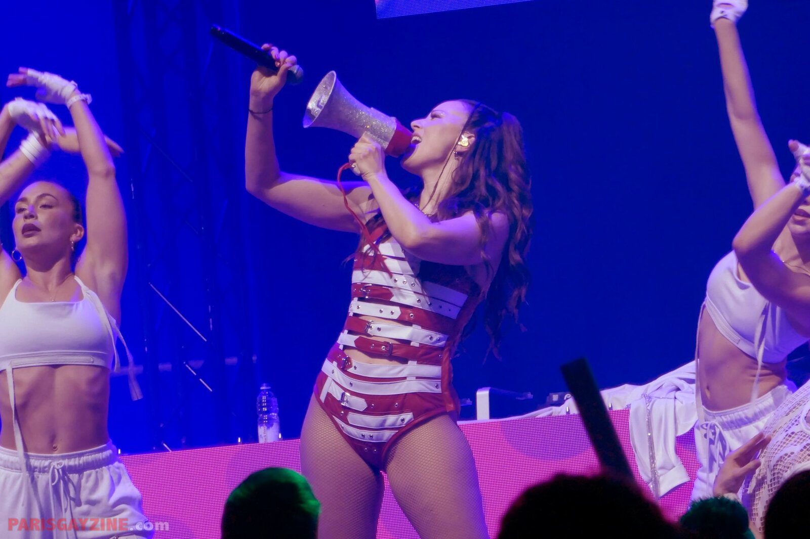 À l’arrière de la scène, quatre danseuses viennent s’ajouter aux deux déjà présentes, accentuant l’énergie visuelle du show.