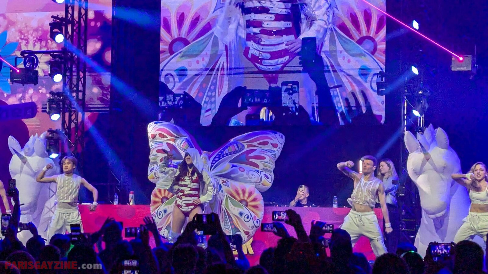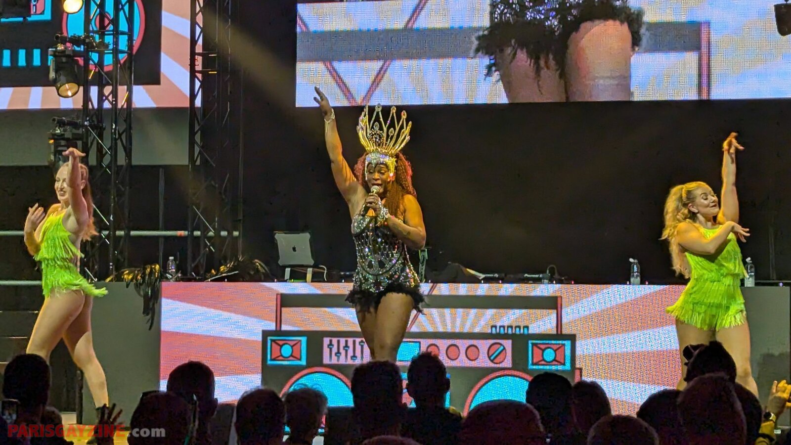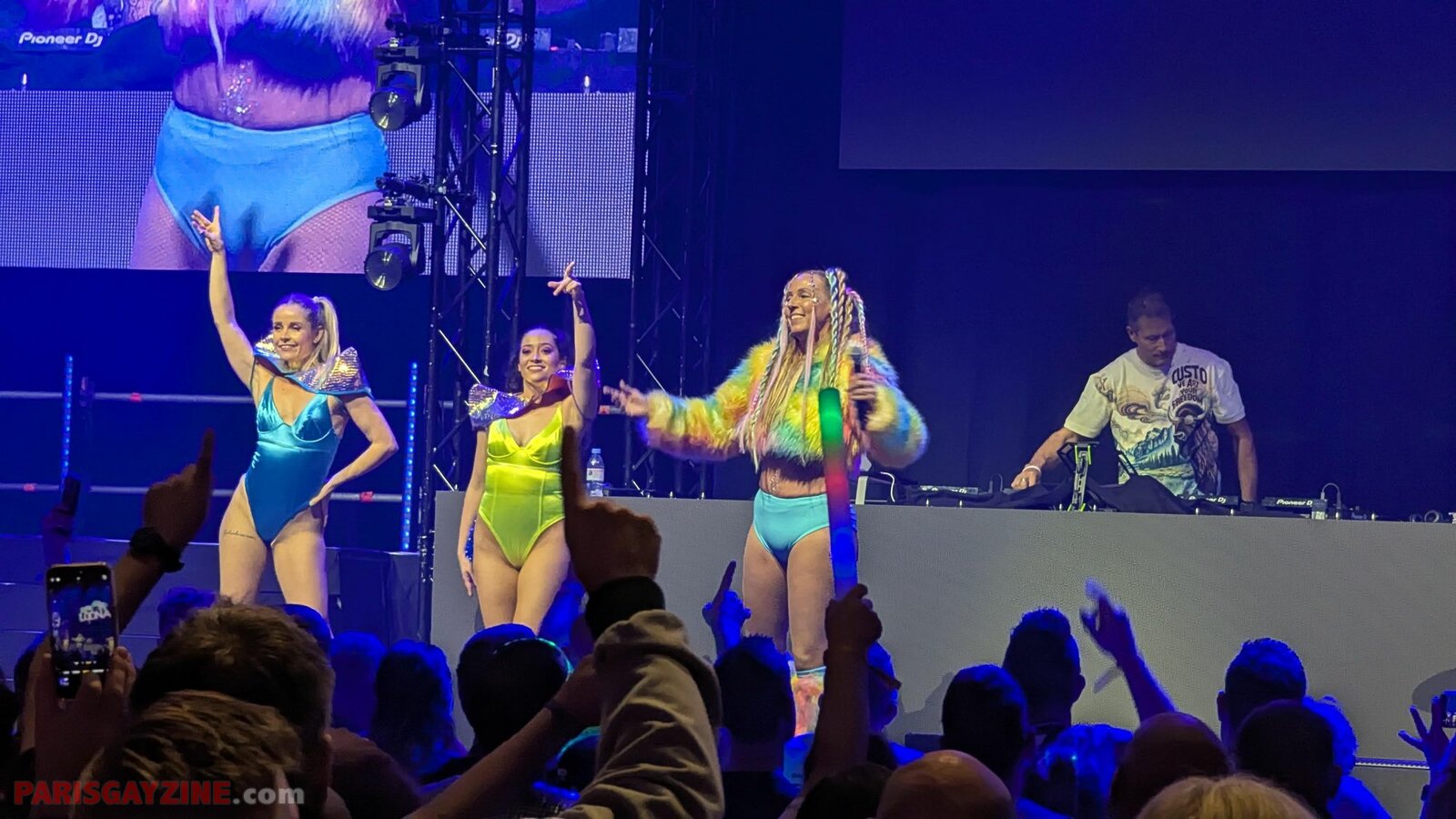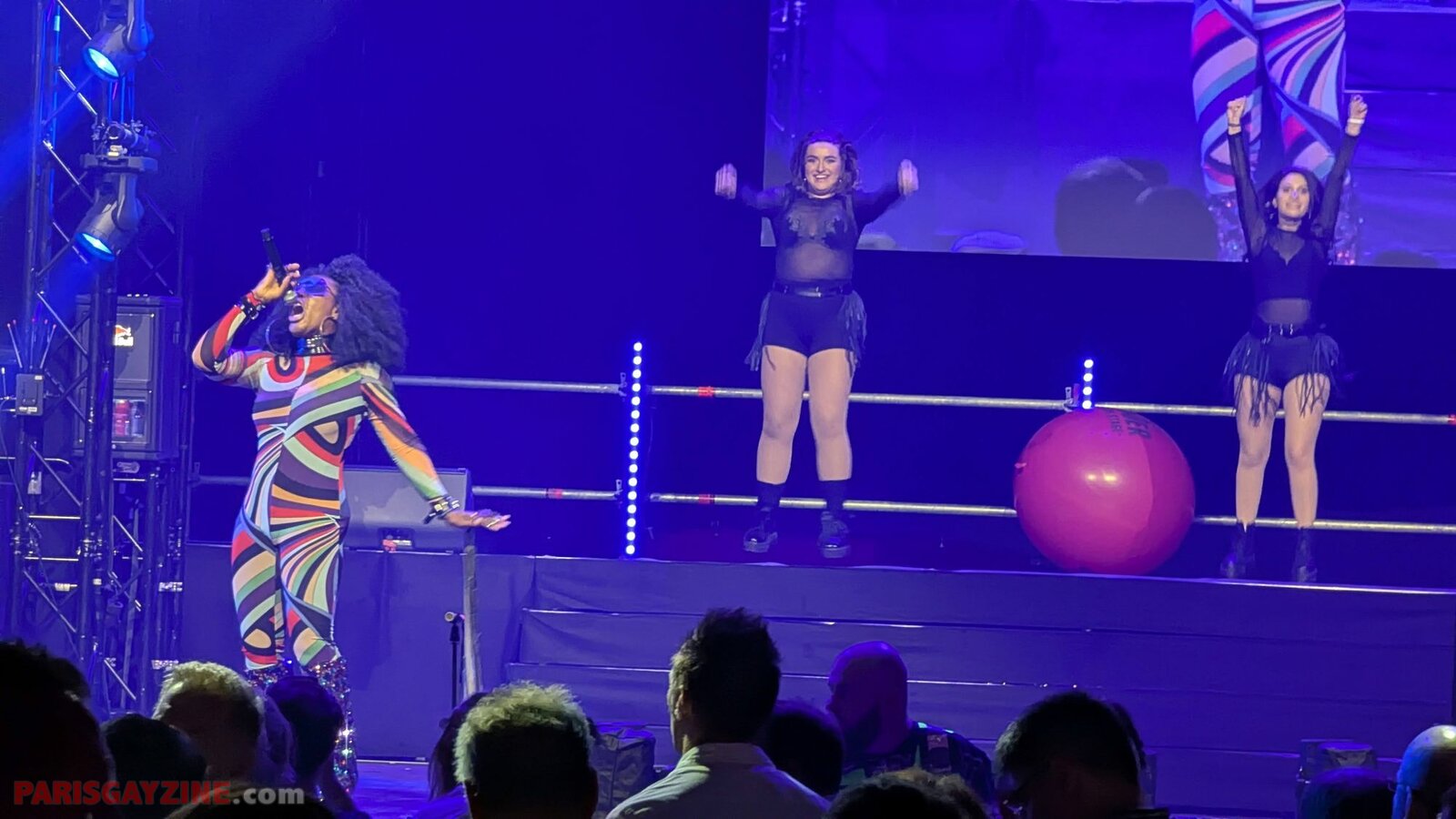 À l’arrière de la scène, quatre danseuses viennent s’ajouter aux deux déjà présentes, accentuant l’énergie visuelle du show.