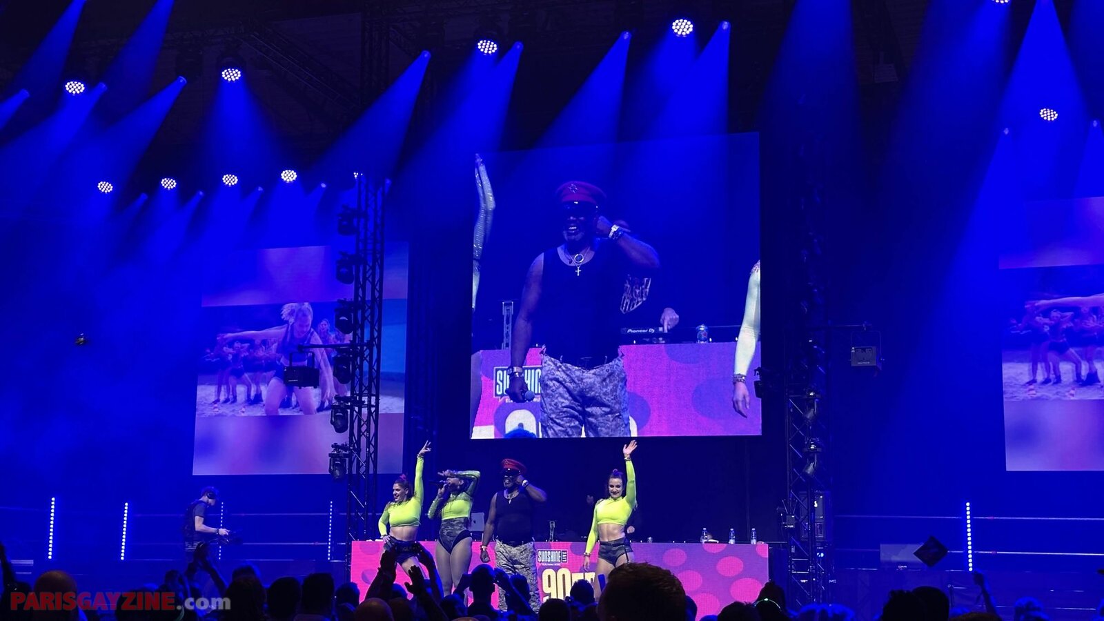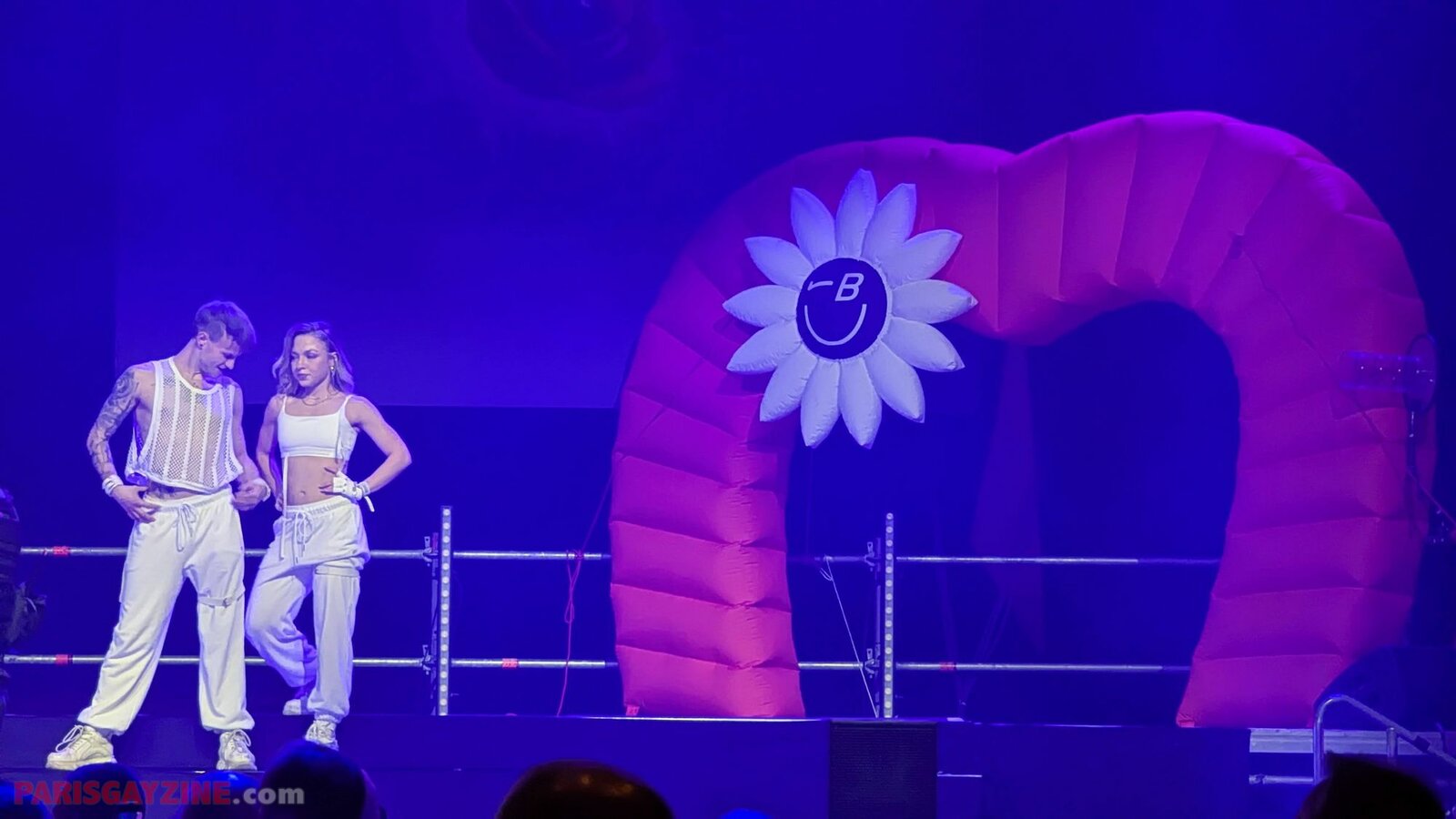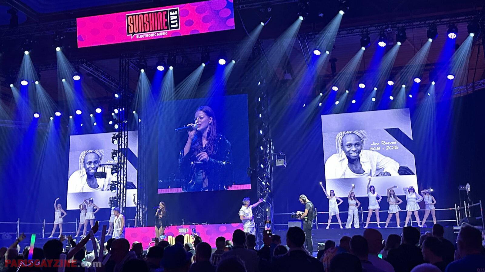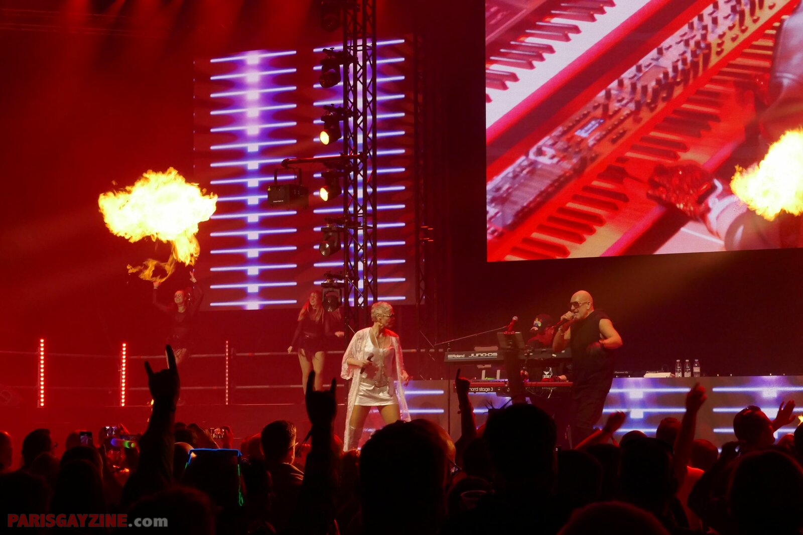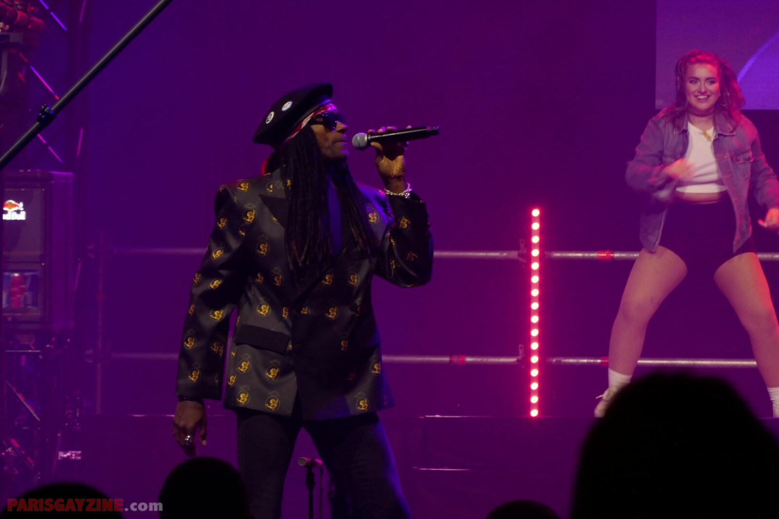 À l’arrière de la scène, quatre danseuses viennent s’ajouter aux deux déjà présentes, accentuant l’énergie visuelle du show.