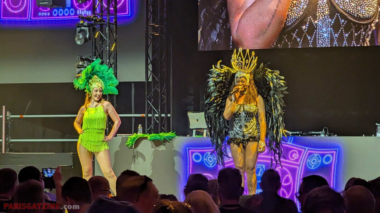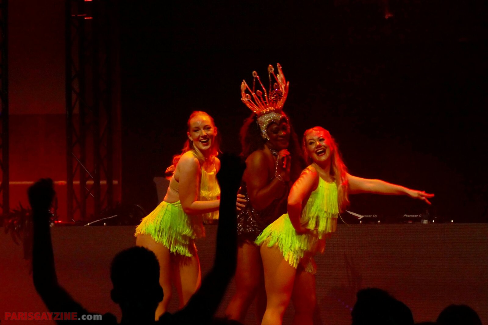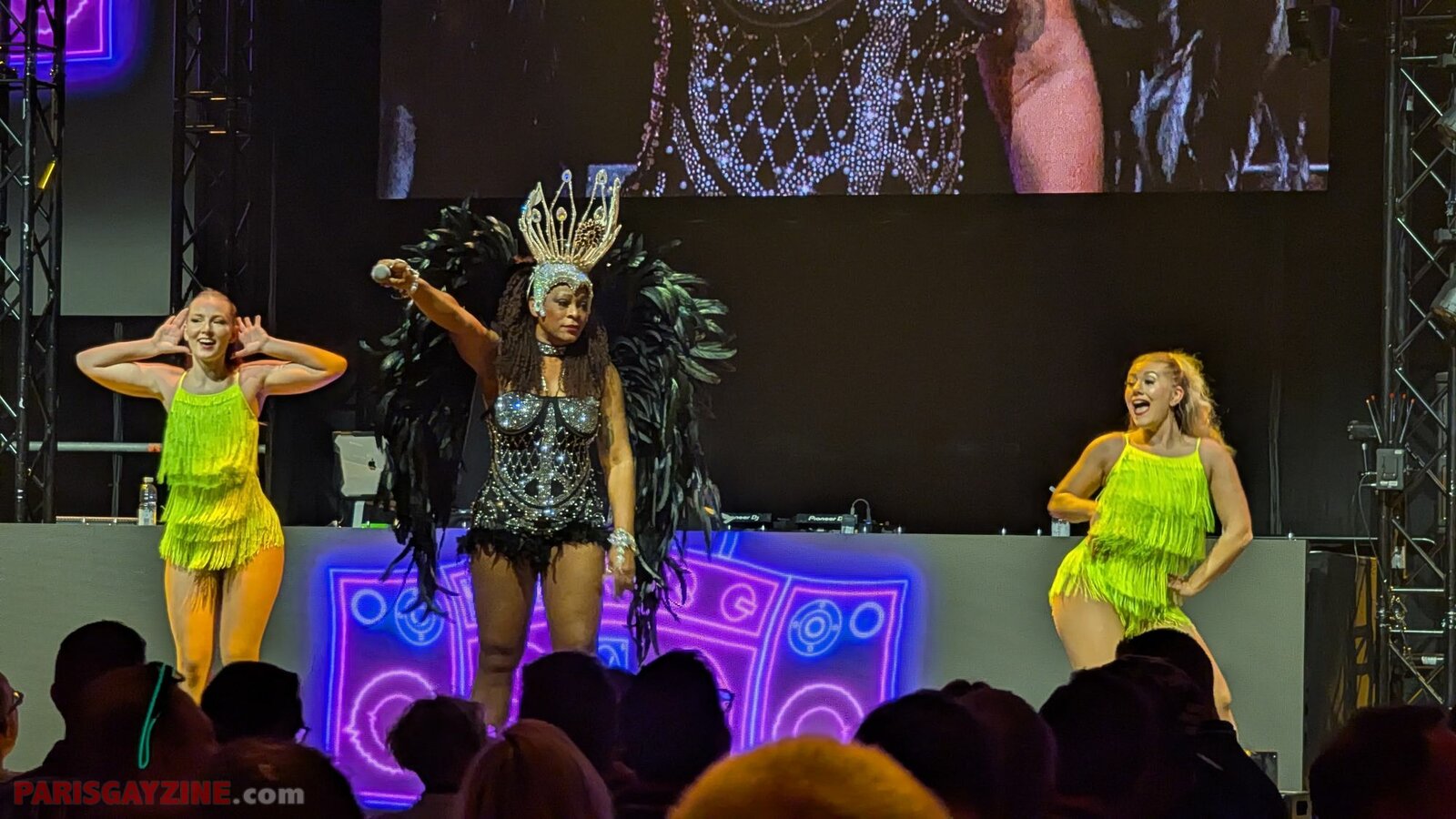 Dans sa tenue à strass et à plumes noires, et sa grande coiffe argentée, Dandara Mira débarque sur scène entourée de deux danseuses brésiliennes. Egalement en tenues courtes, celles-ci portent du fluo, que ce soit leur body à franges jaunes que leurs coiffes vertes.