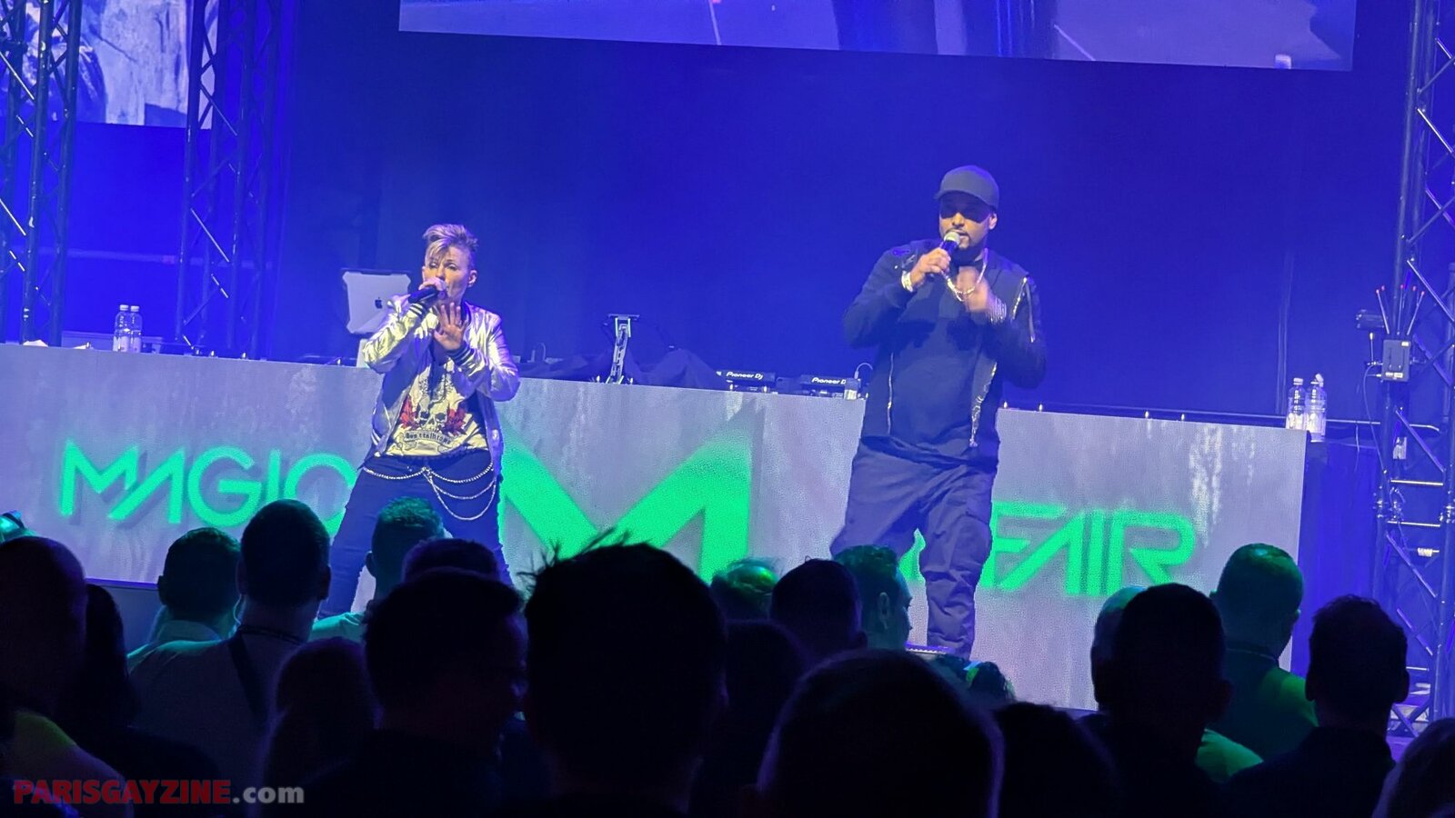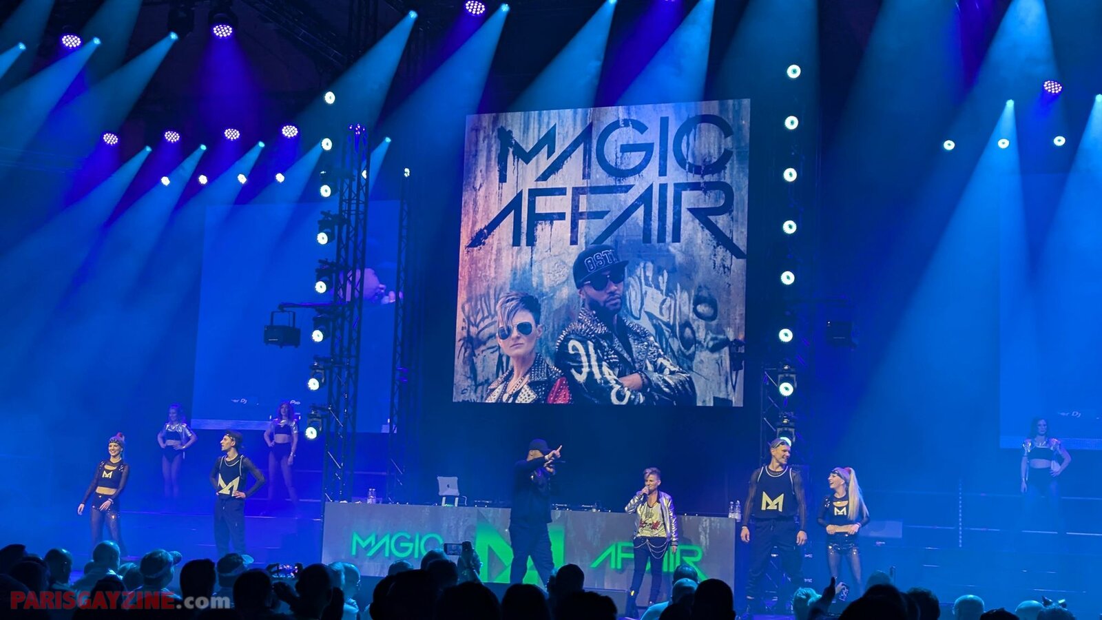 Les Magic Affair enchaînent sur un beat efficace avec Rebel Yell, enregistré en 2022, reprise du classique de Billy Idol - revisité ici dans un registre dance-rock énergique. Huit danseurs et danseuses occupent l’espace autour du duo, et renforcent la dimension du tableau. Derrière eux, le logo du groupe reste affiché en vert, omniprésent, comme une signature visuelle.