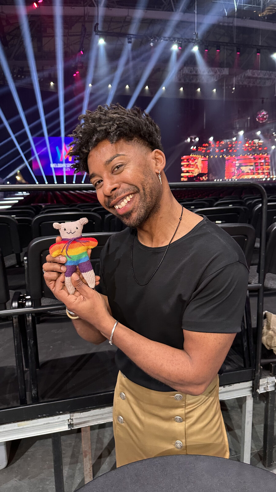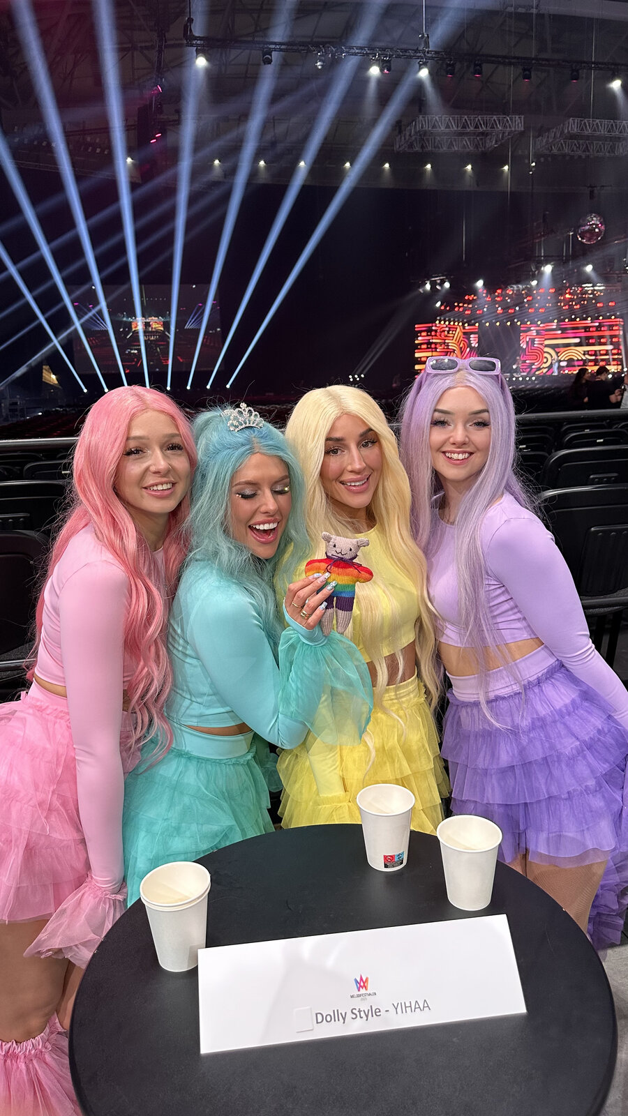 Ces quelques clichés capturent plus qu’un simple moment backstage : ils symbolisent le soutien, la bienveillance et l’esprit festif qui rendent le Mello si spécial. Rainbow Bear ne distribue pas des points… mais il offre quelque chose d’encore plus précieux : une dose officielle de sparkle avant de monter sur scène 💖🐻✨