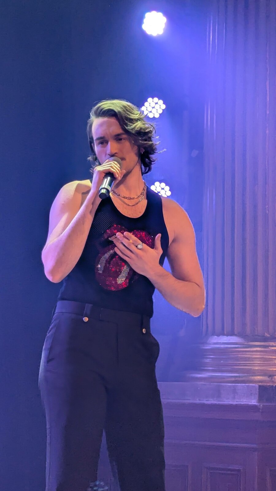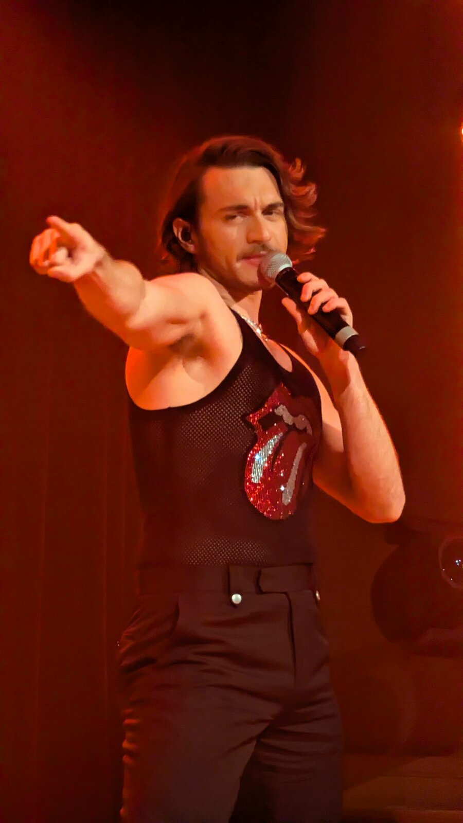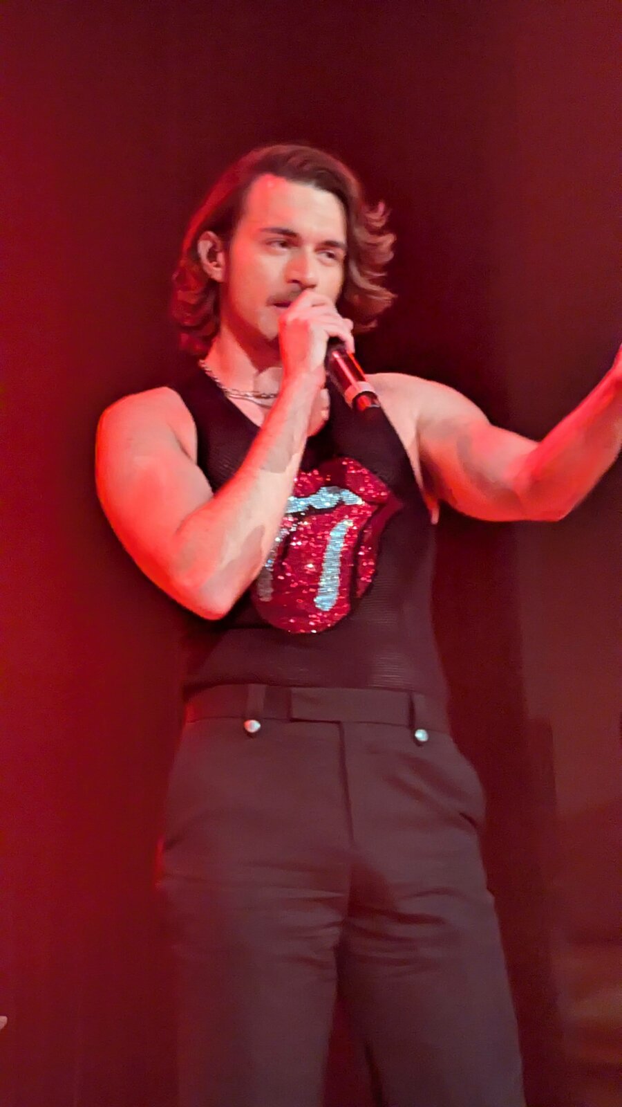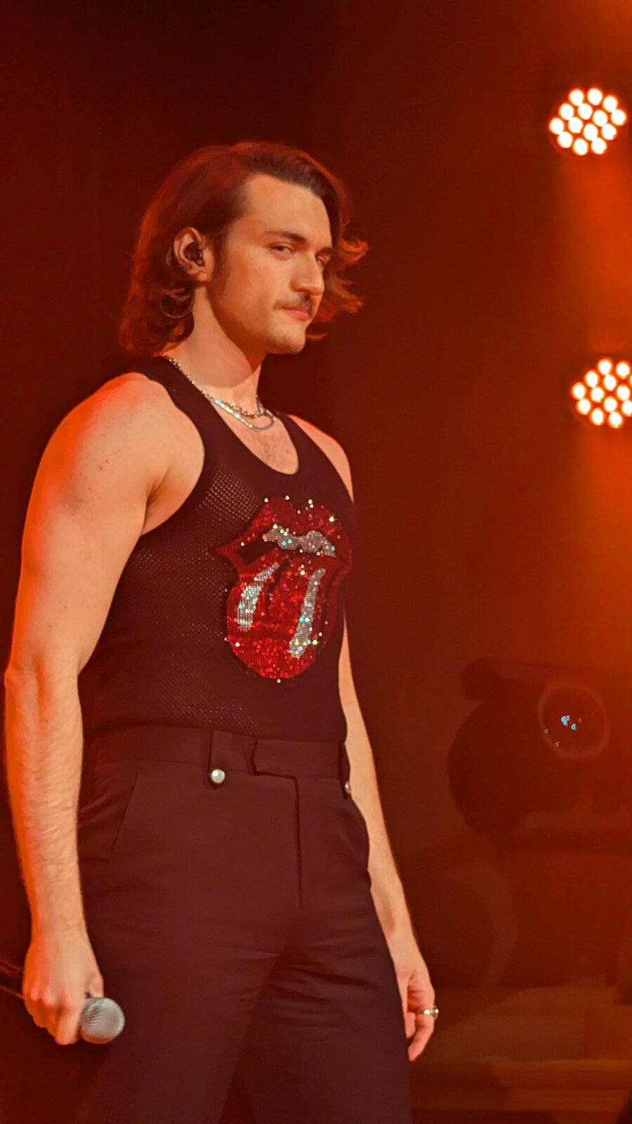 Le chanteur de 26 ans apparaît en débardeur orné de la célèbre langue des Stones, affichant un style résolument sexy.