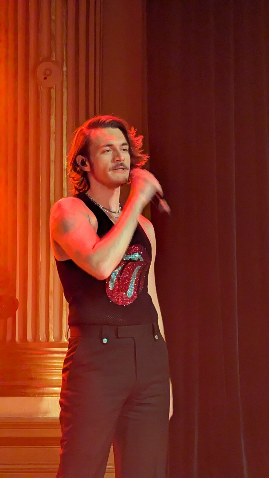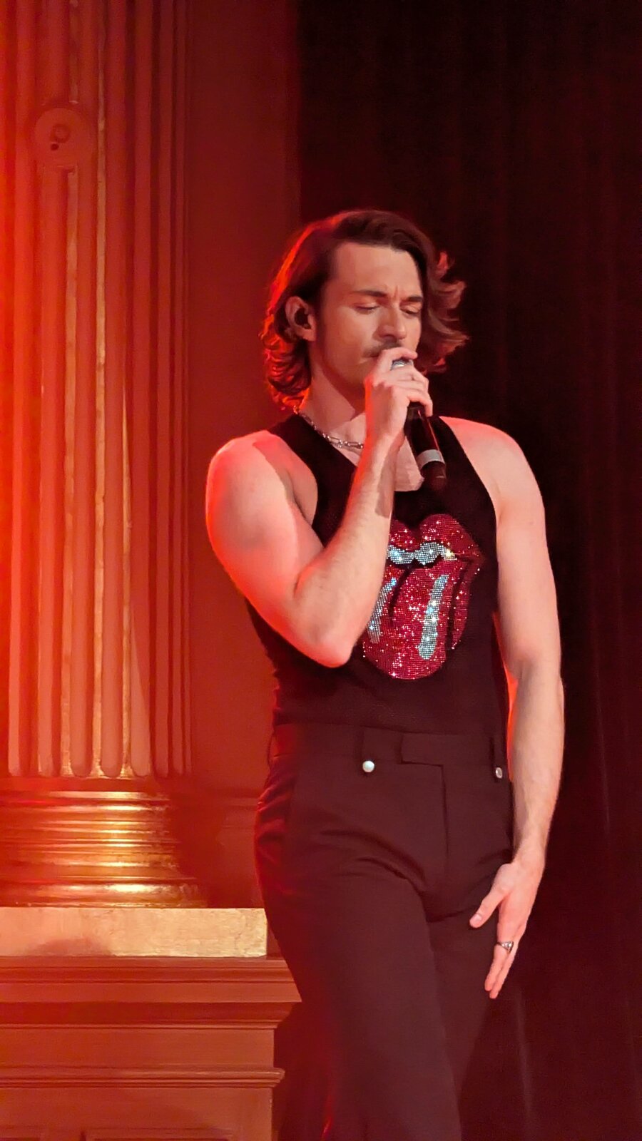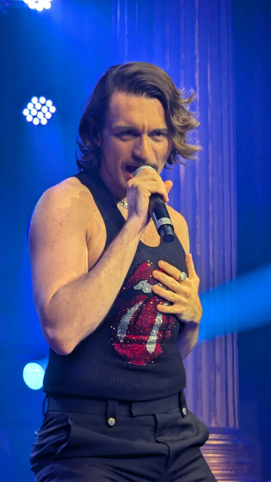 Le chanteur de 26 ans apparaît en débardeur orné de la célèbre langue des Stones, affichant un style résolument sexy.