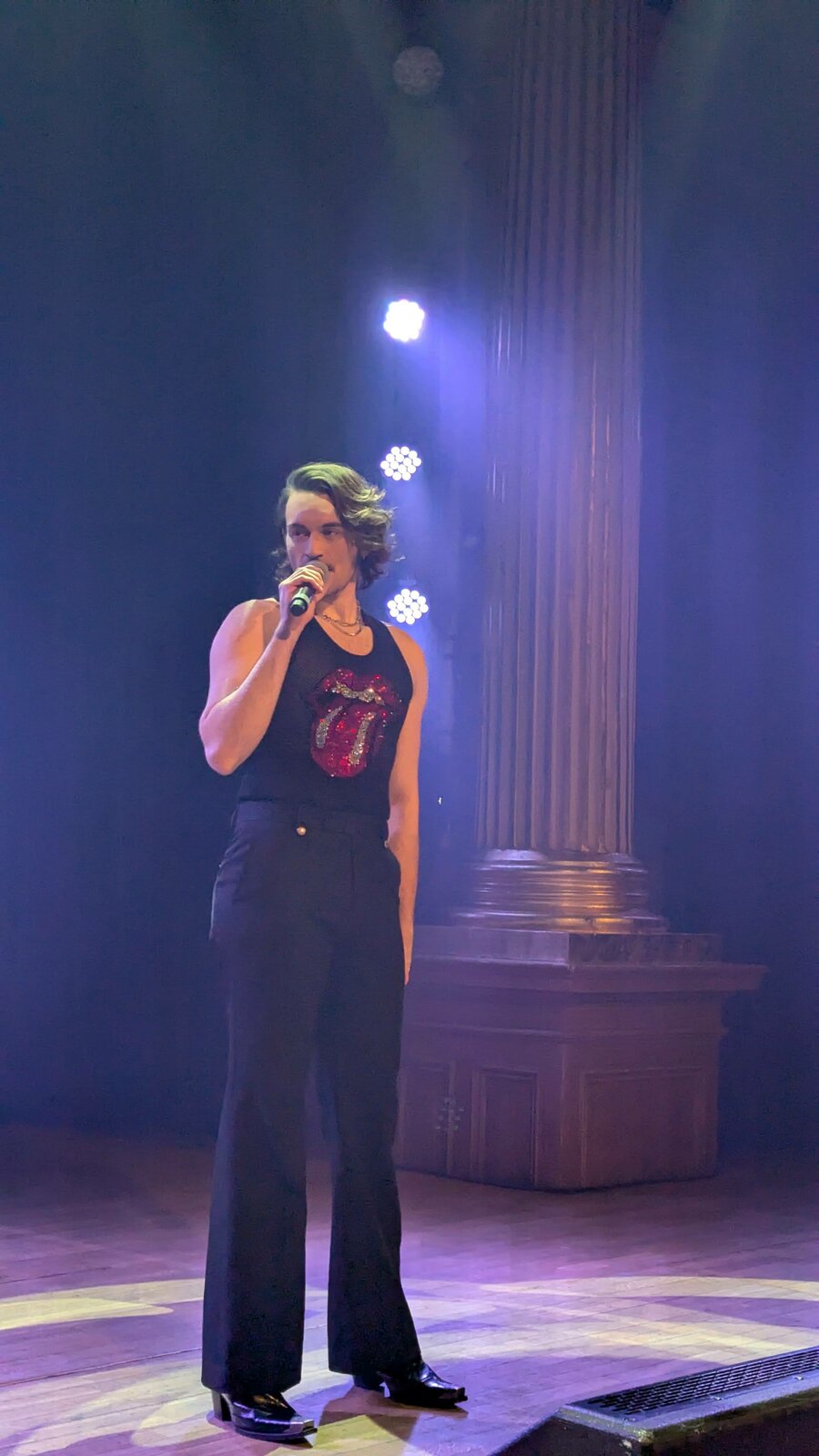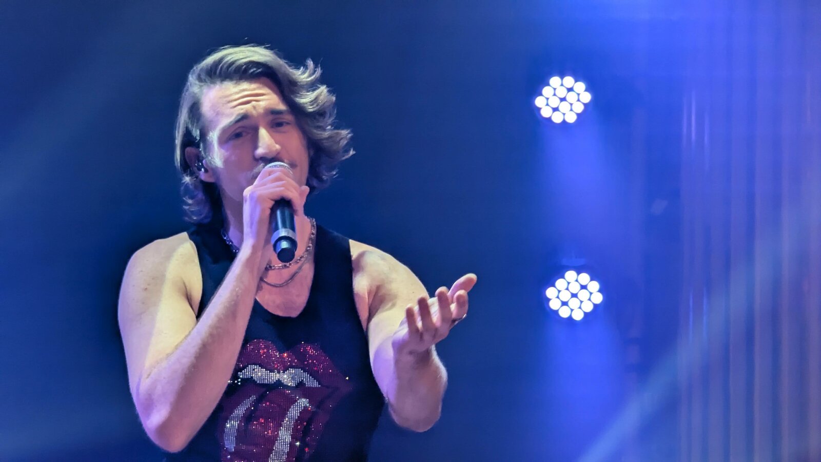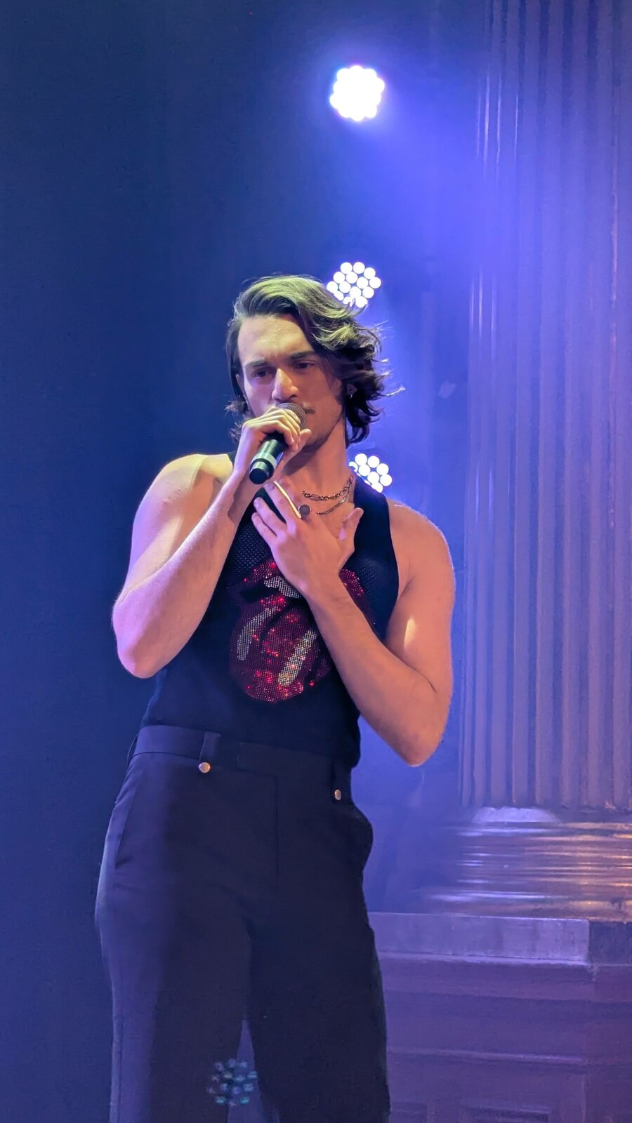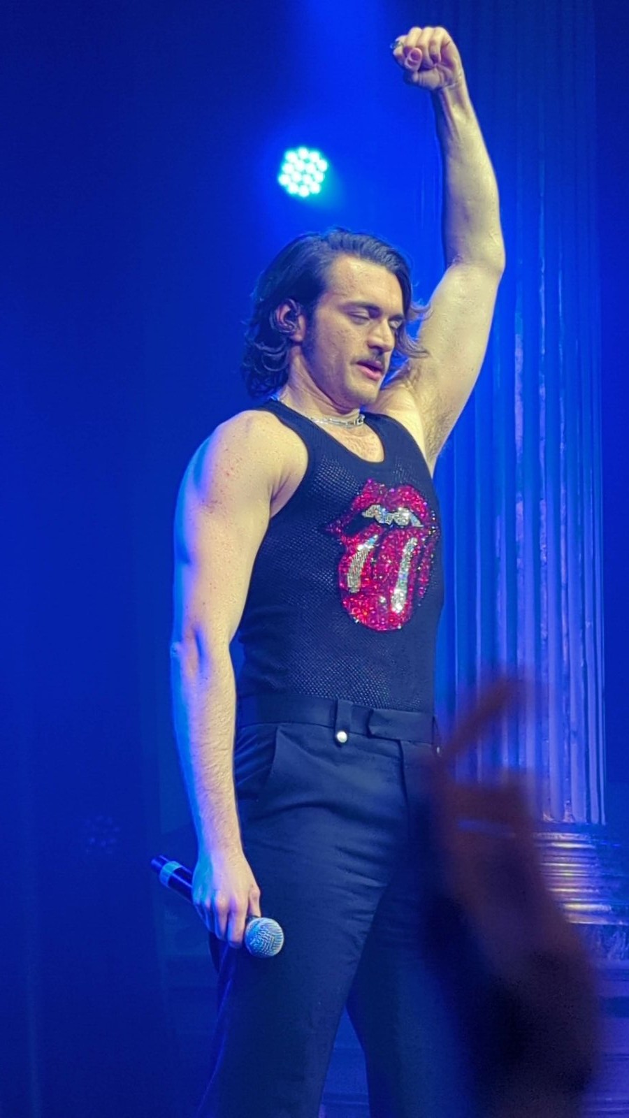 Le chanteur de 26 ans apparaît en débardeur orné de la célèbre langue des Stones, affichant un style résolument sexy.
